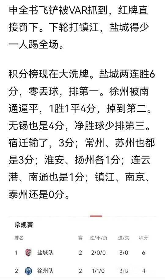» 盐城6分领跑,苏超进球比快递还慢,下轮谁先破蛋?