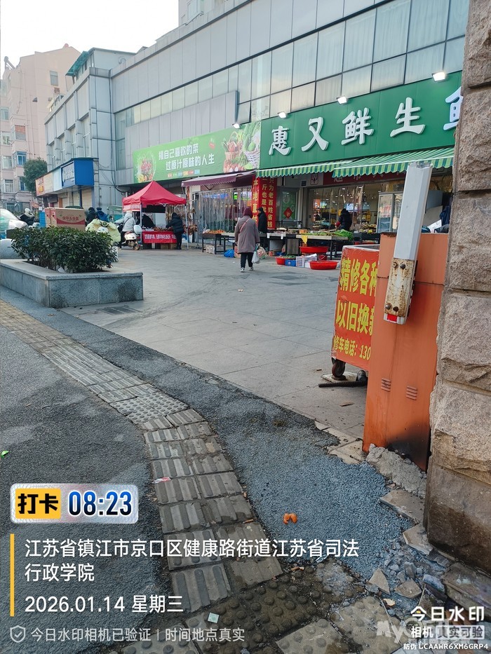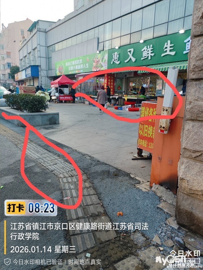 本人曾于2025年5月至10月通过12345热线就该问题进行了反复举报,一直未得到妥善解决;2025年9月本人在12345热线、0511梦溪论坛官网、市城管局的官网上同时反应,相关部门在10月中旬给予回复(2025年10月21日京口区城管局在0511梦溪论坛官网上的回复:桃花坞惠又鲜超市(桃花坞一区 5-18 号,属司法警官学校商住楼,由锦苑小区物业托管)经营场所位于道路红线外。健康路街道综合执法和应急办接投诉后,多次赴现场处置,对超市开展上门教育、督促整改,并下发责令改正通知书,要求其不得占道经营影响市容。目前超市已配合收回空地上的障碍物,将经营物品移至门楼下。近期与投诉人沟通确认,其提出的“门前不放架子、筐子” 诉求已整改到位,后续街道将组织网格员重点巡查,加强该区域管控。),此事才得以解决。之后几个月,情况有所好转,占道行为收敛。然而,自2025年12月以来,该超市经过重新装修开业,占道经营行为不仅恢复,而且变本加厉,规模、时长均远超以往,呈现“报复性”反弹态势。