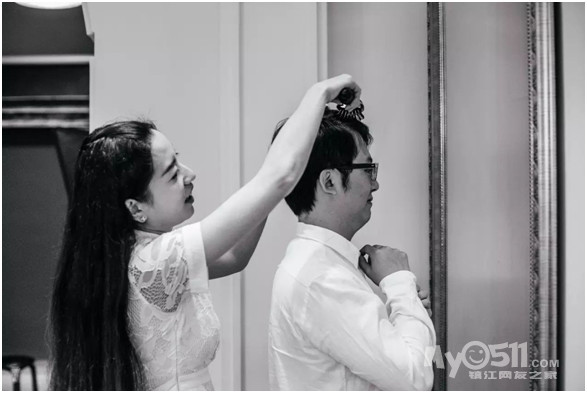 她细心地给他整理头发,这么重要的照片可不能大意了