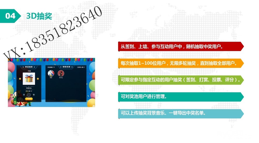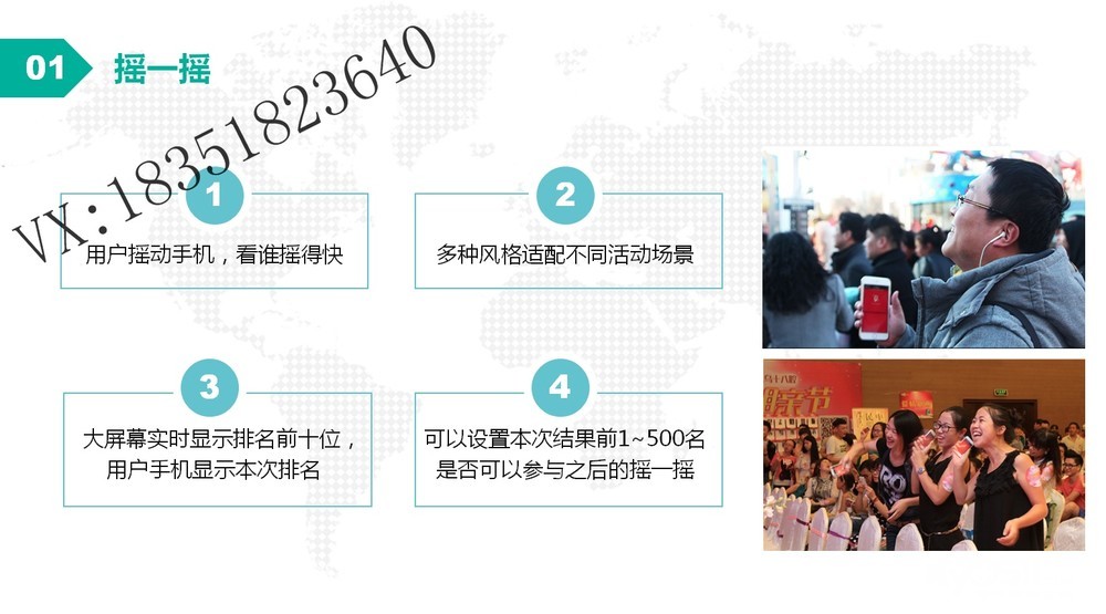 燃爆气氛 专注互动 V现场——你身边省心、省事、省力的活动管理专家 1.360度全景体验 2.智能签到 3.3D签到 4.微信上墙/弹幕 5.3D抽奖 6.抽奖箱抽奖 丰富游戏体验 超多游戏选择!!!专为公关活动、会议、婚庆、年会私人定制!!!需要可添加微信:tys18351823640