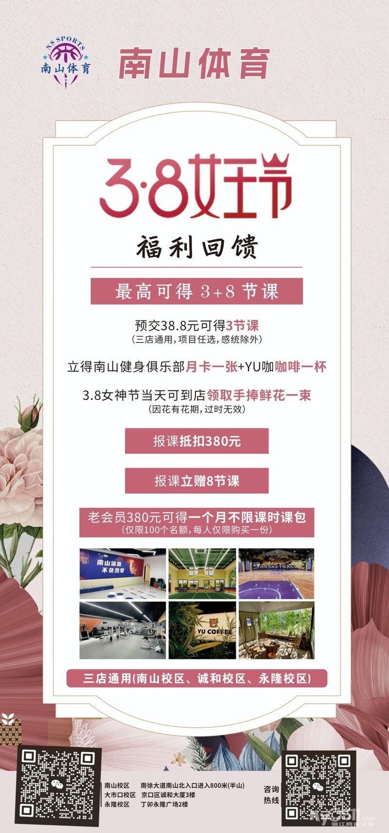 南山体育38女神节新老会员福利回馈来了,最高11节课时38.8元抢购新客户专属福利礼包,更有老会员特价优惠!仅限前100名,详情咨询:18021211880王