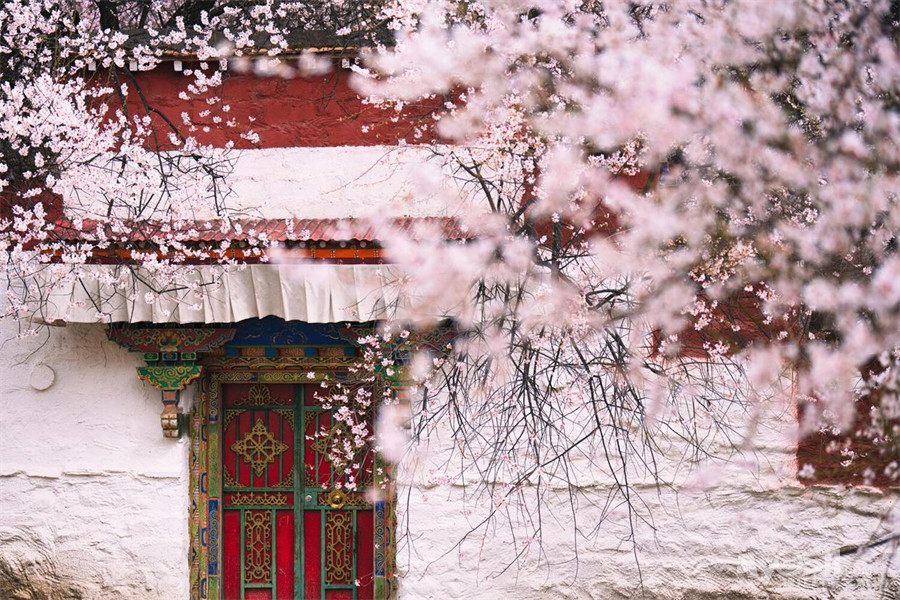 倾多镇 不用无人机即可俯瞰倾多桃花田。西藏地区特有的红白墙与粉白的桃花的交相辉映;