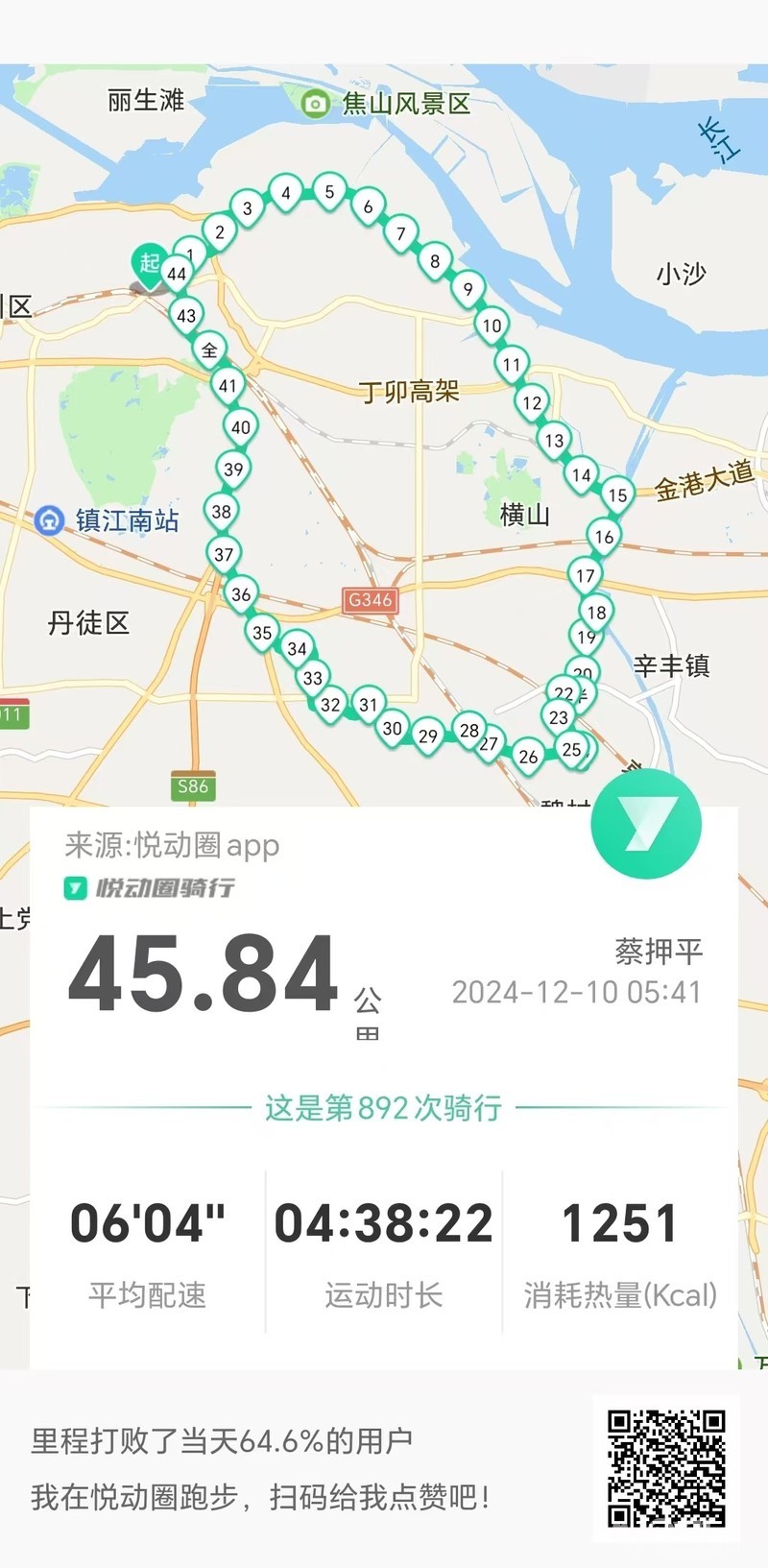 早5点40分岀发沿中山路、梦溪路、东吴路、禹山路、左湖路、金港大道、金鼎大道、自三廊庙始骑行村村通,由后北村上谷阳东大道、官圹桥路、解放路、市政路、将军巷于10点20分平安到家。