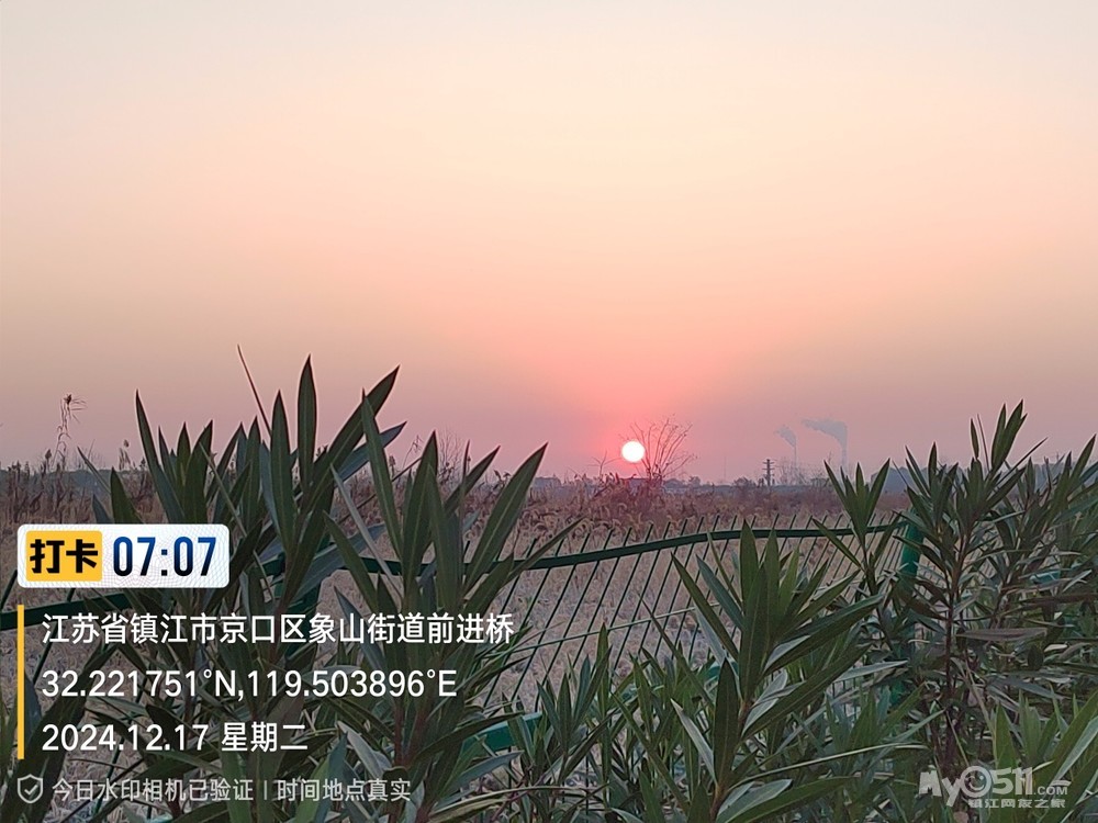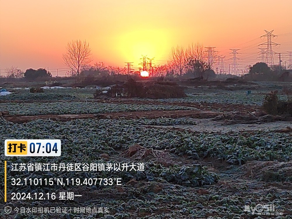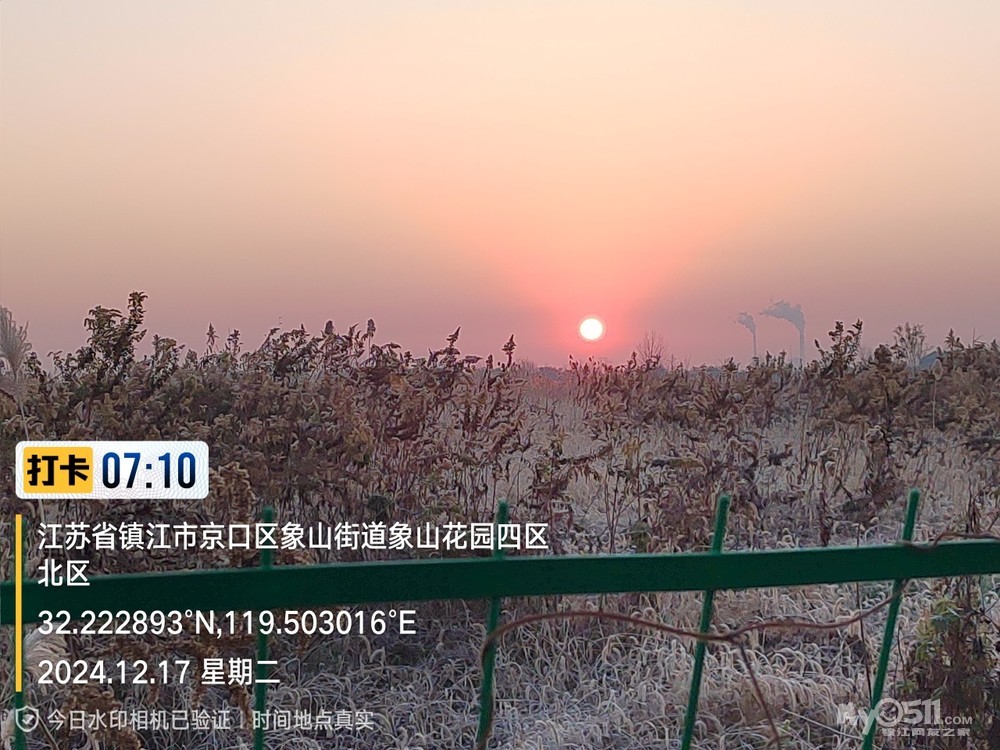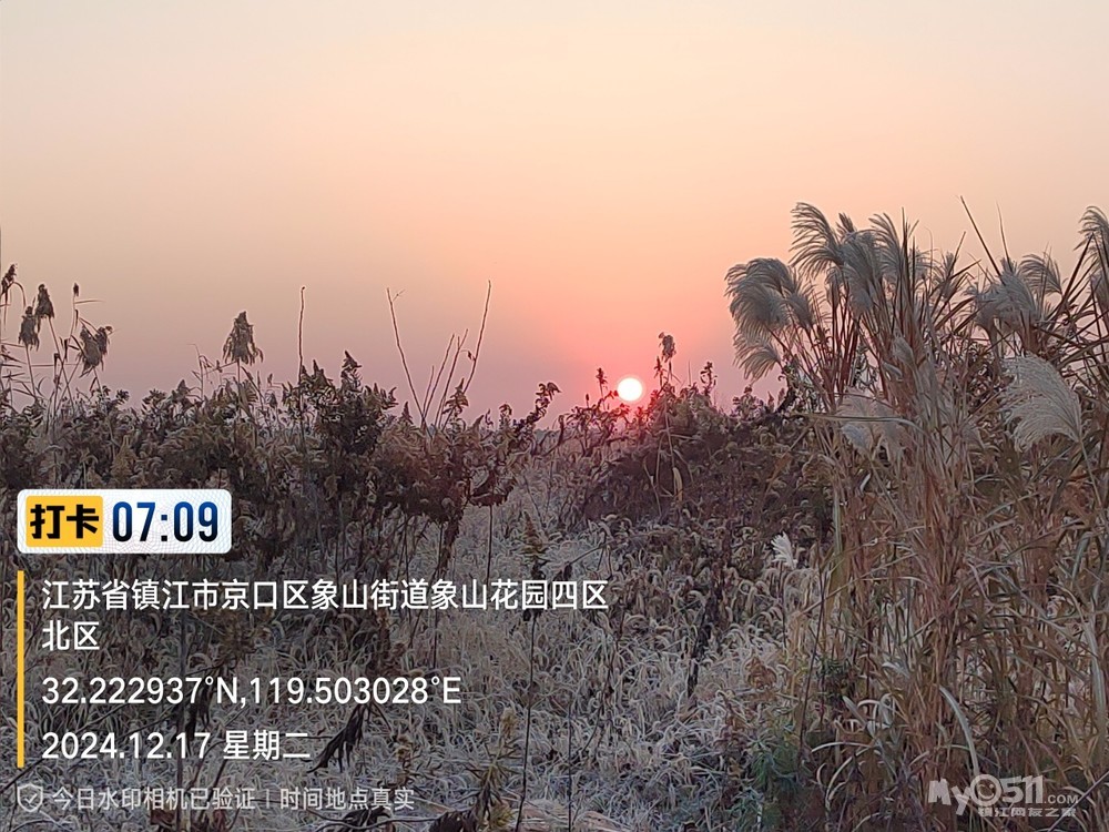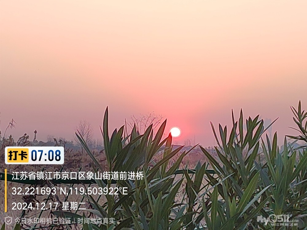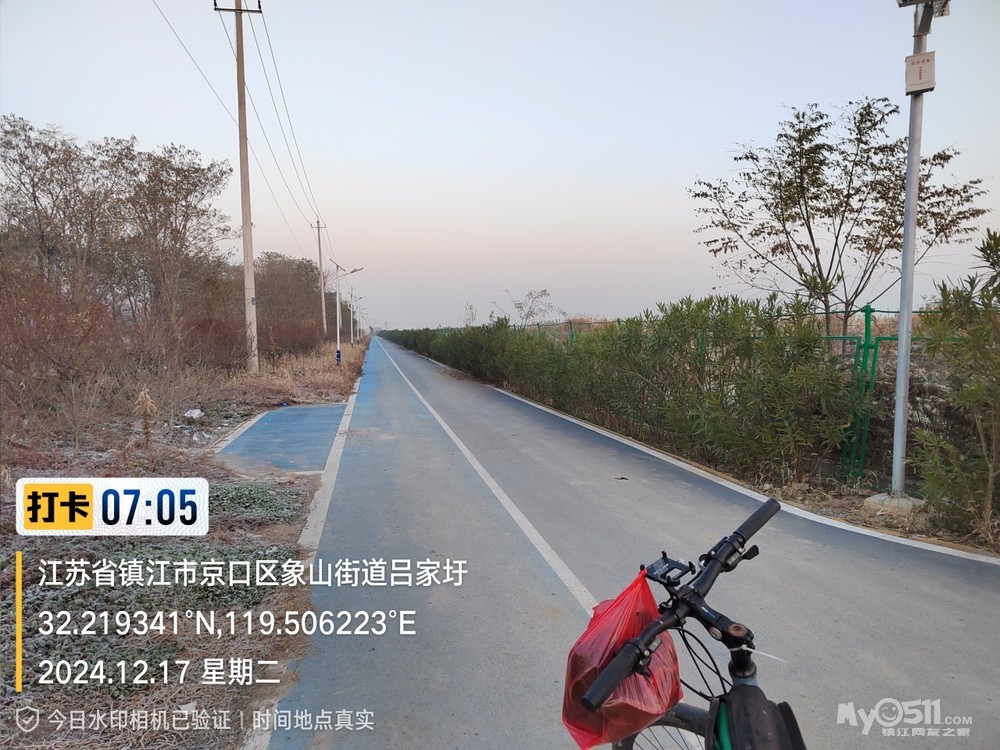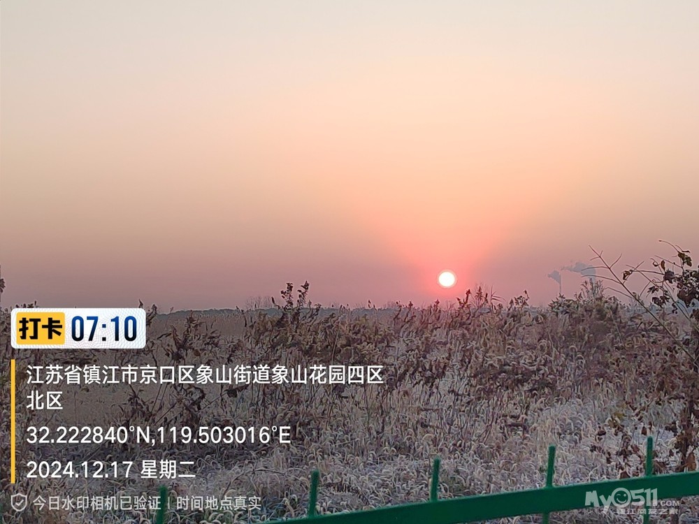 今早5点52分出发晨,沿健康路、正东路、学府路、禹山路、千棵柳、在经检察整改的东东垃圾填埋场看日出,汝山路、京江路、航道路、征润州路、中山北路、到米方路大菜场买菜后,经朱方路、中山路、于9点35分平安到家。