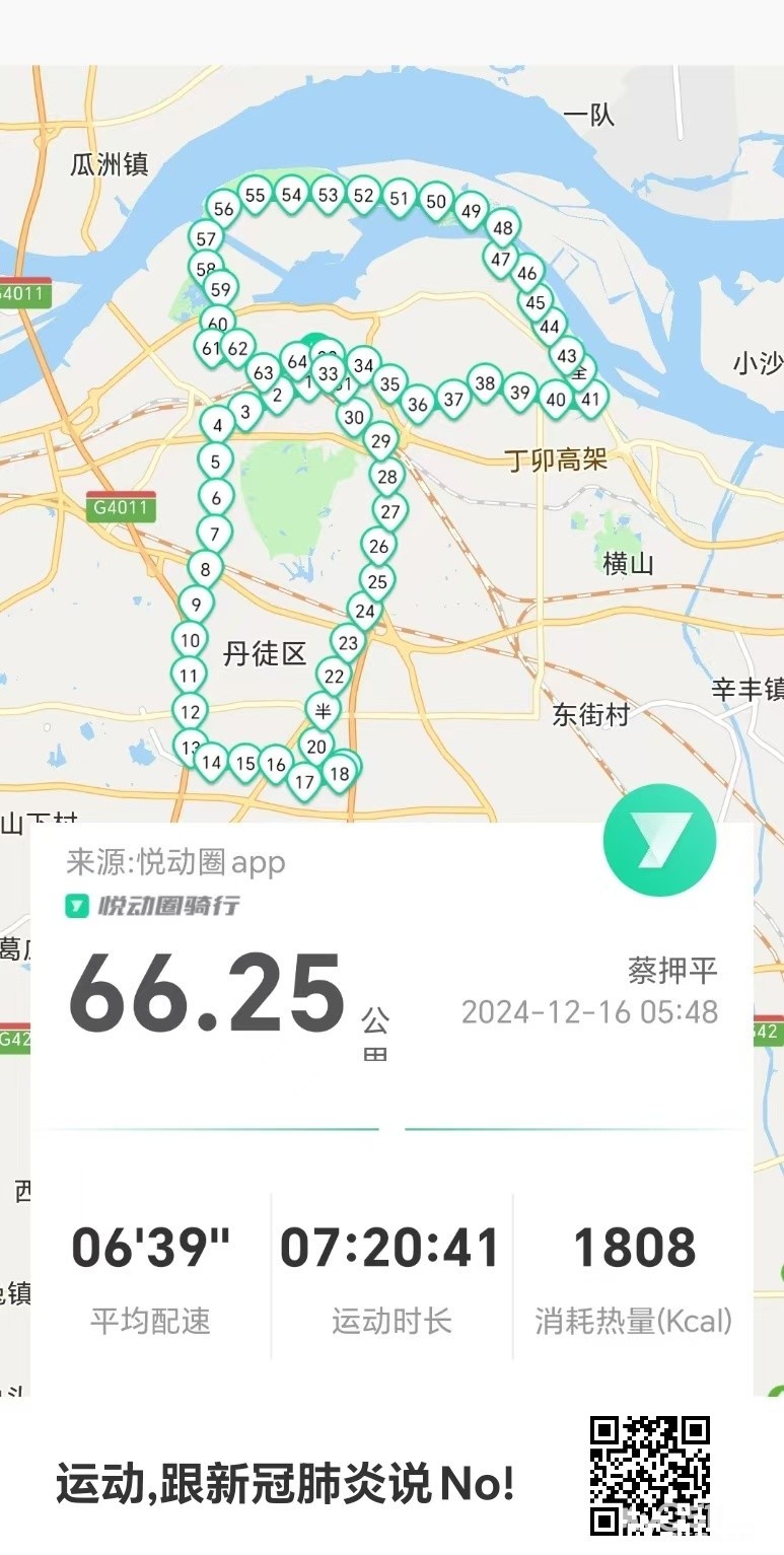 昨天5点48分出发晨骑,沿健康路、北府路、檀山路、茅以升路、西石线、S265、西鹿新村、恒顺大道、S265、官圹桥路、解放路、市政路、将军巷于8点20分平安到家。
