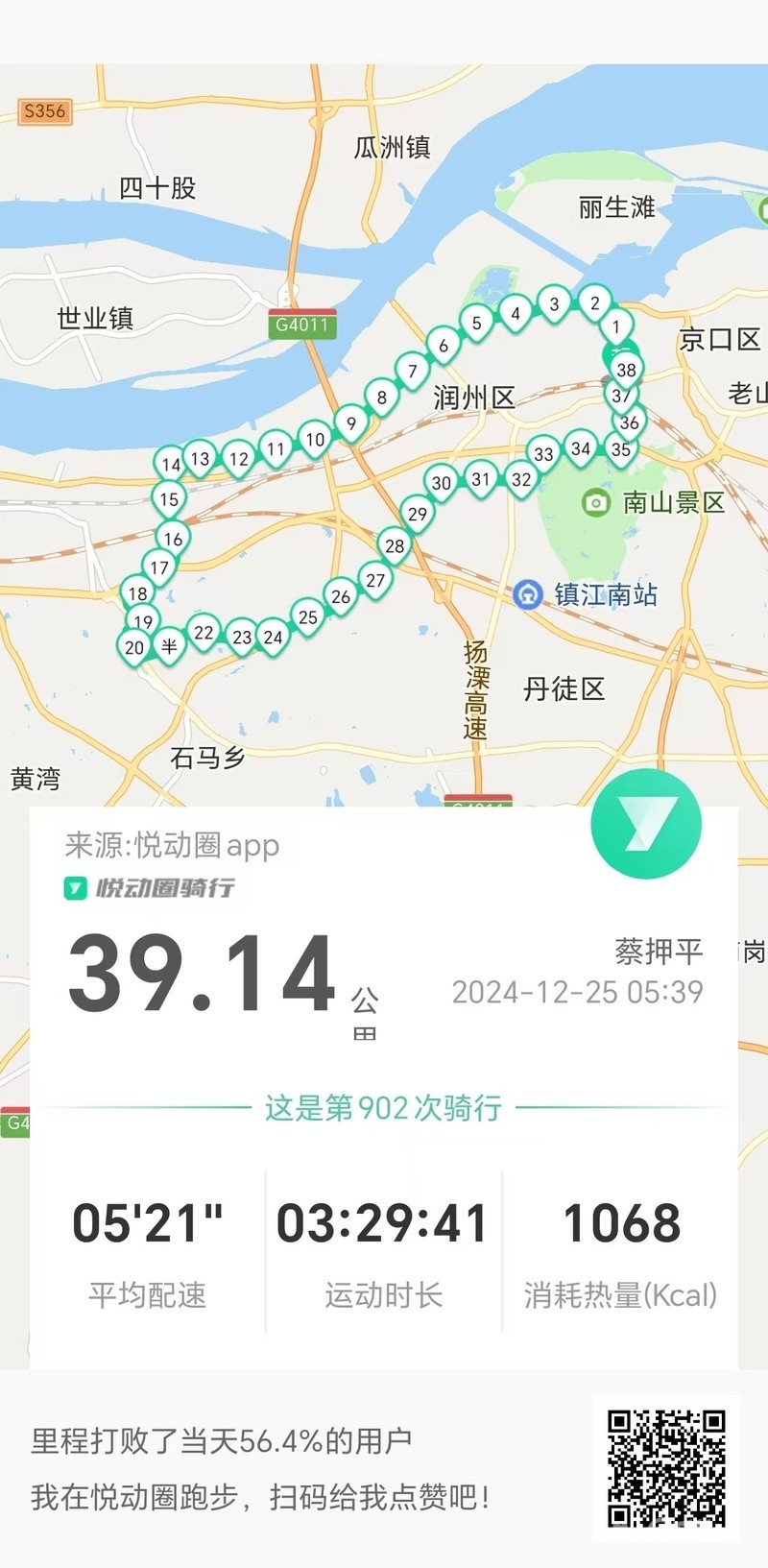 早5点39分出发晨骑,沿中山路、双井路、长江路、S338、居东路、G346、长香路、东斛村、华家村、S243、蒋桥镇、团山路、九华山路、南徐大道、黄鹤山路、林隐路、黄山东路、健康路于8点50分平安到家。