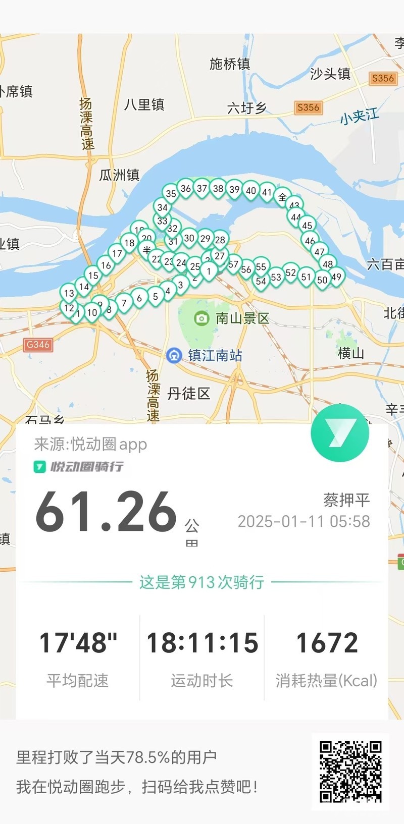 早6点岀发晨骑,沿健康路、北府路、檀山路、南徐大道、跨铁路天桥、观音禅寺、龙门港路、京江路、兹寿路、环湖路、长江路、太平路、运粮河路、朱方路农贸市场买菜、朱方路、中山路于8点51分平安到家。
