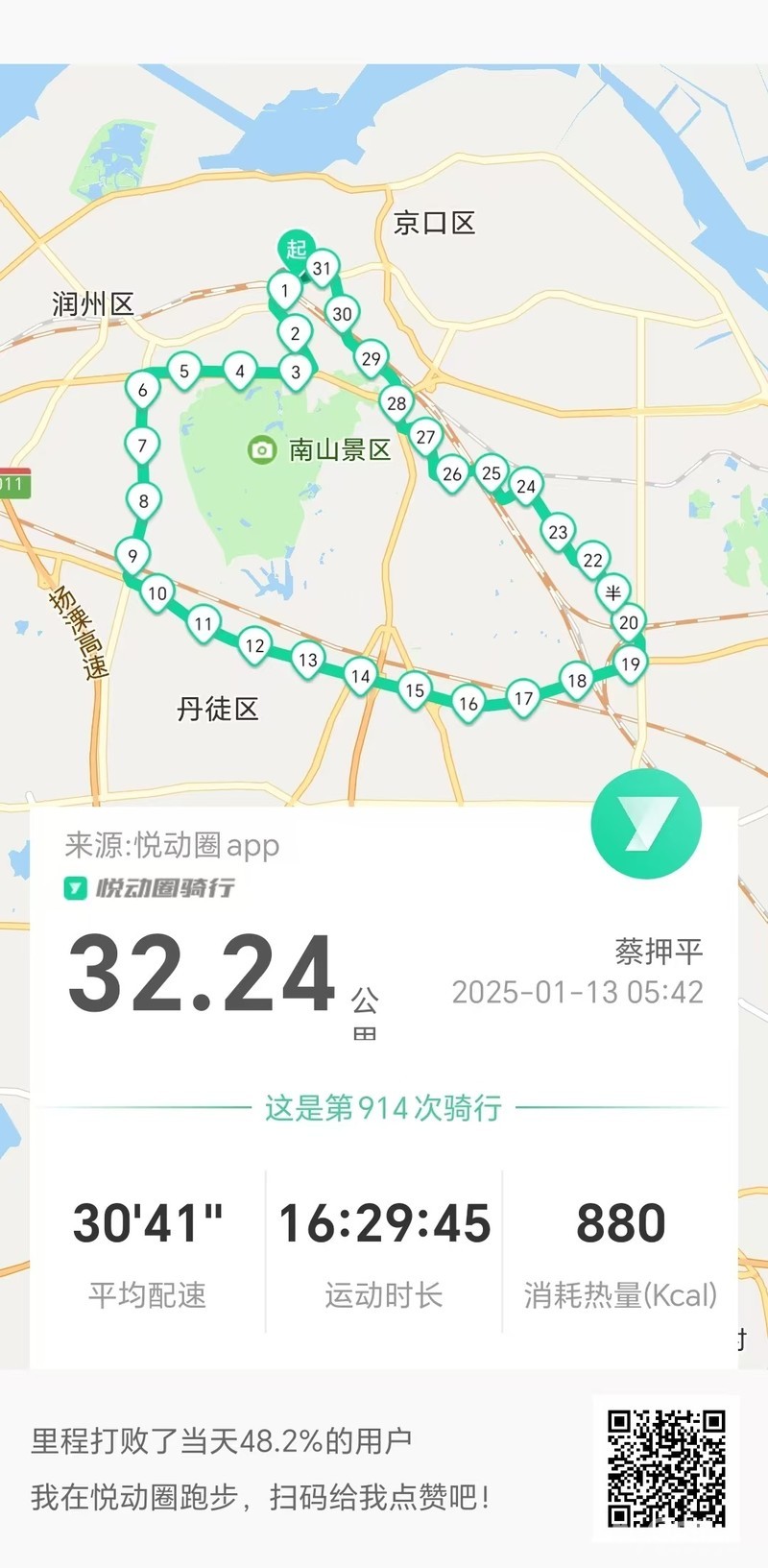 五点起床即早课,喂水翻身换尿裤。速速洗漱去晨骑,健康北府檀山路,京润大道转向东,官圹立交看日出,智慧大道石淙路,扬帆路达美林湾、谷阳路转官圹桥路,解放路又健康路,经折巷经白莲巷,山门口街将军巷8点45分平安到家。