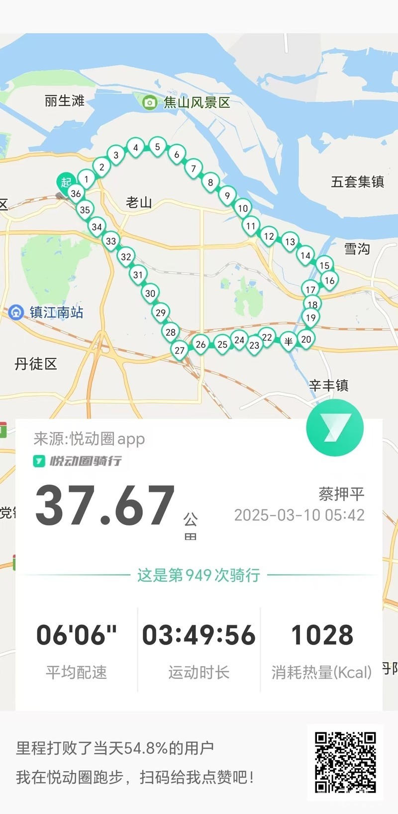 早5点42分岀发晨骑,沿中山路、梦溪路、东吴路、禹山路、求索路、越河街、雩山街、公园路、京口工业园区、G346、东石村、西石村、前裴村、G346、宝平路、官圹桥路、解放路、市政路、将军巷于9点35分平安到家。