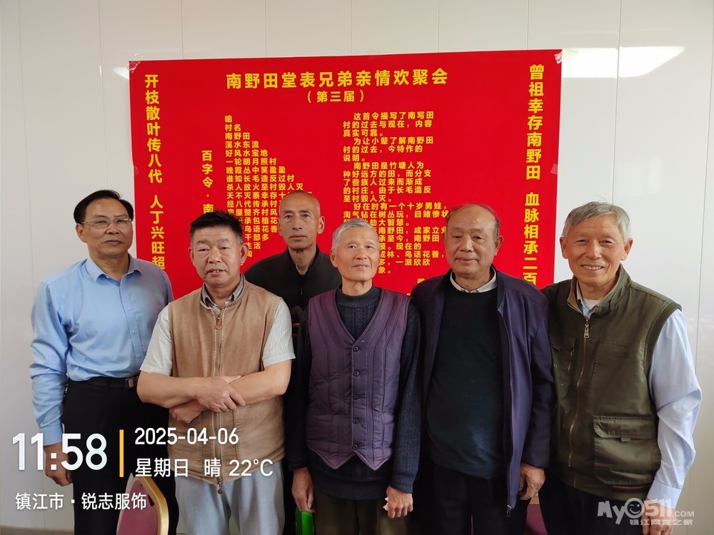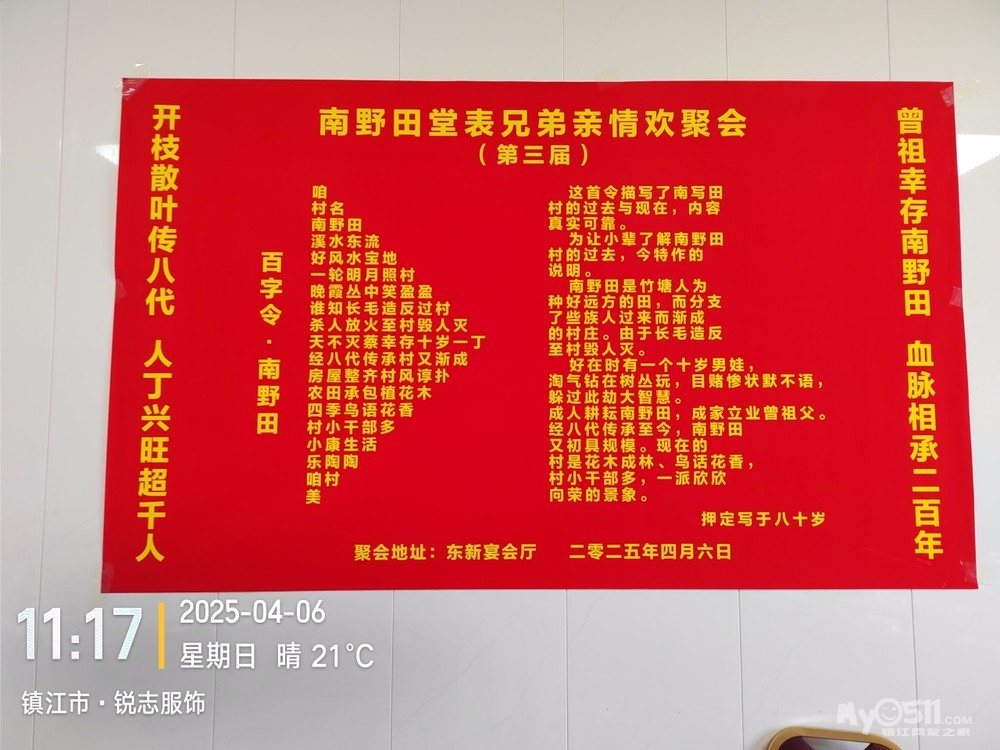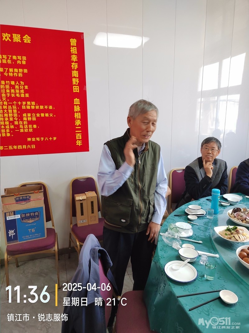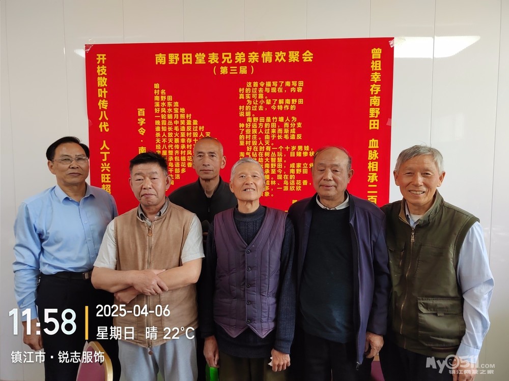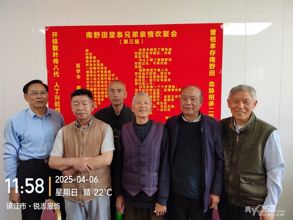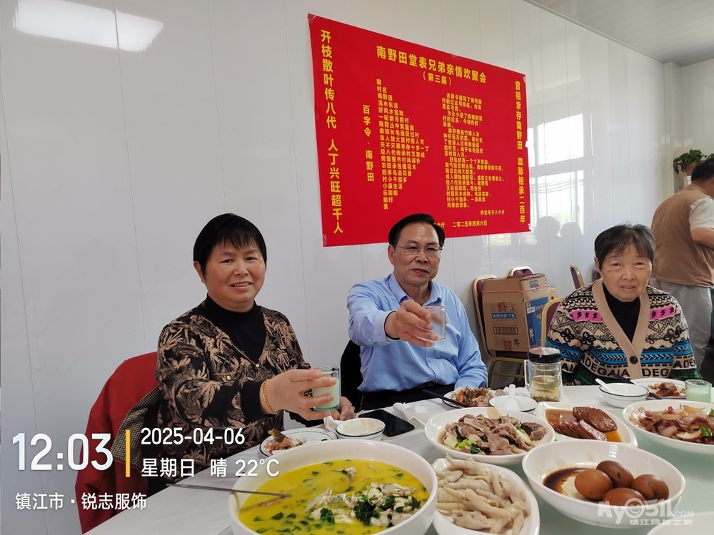 乙巳蛇年三月初九是老父亲的祭日,并且是四十周的祭日,半月前就对儿子说明今天必回一趟老家,要求他调好班,可来陪一天妈妈,他早早与同事商量调好四月六日休息的班,我就可以去老爹的墓前祭拜老父亲了。同时自己因1975年当兵离开南野田整整五十年了,想趁父亲四十年祭典日,邀请堂表兄弟们举行一次亲情聚会,同时举行“胖豆腐”背井游离南野田五十年随想联欢会。为同一天办好三项活动,我拟了二幅会标,在老家的东新宴会厅预定了,有二张可坐18人的大桌子的大包厢。南野田堂表兄弟亲情欢聚会(第三届)曾祖父幸存南野田,血脉相承二百年。开枝散叶传八代,人丁兴旺超千人。“胖豆腐”背井游离南野田五十载随想联欢会应征当兵五十载,背井游离南野田。涅槃重生贺兰山,转业镇江品五味。