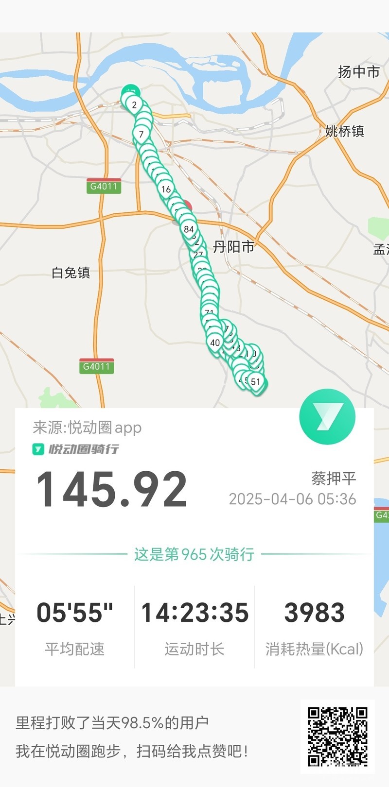 今天的悦动圈又虚报战功了,实际行程应120公里左右。