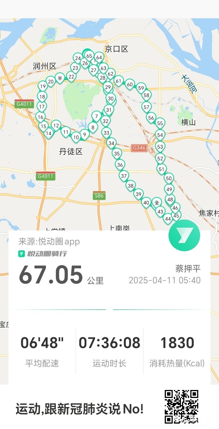 早5点40分出发晨骑,沿健康路、黄山东路、官圹桥路、环山路赏樱花、G346、严庄村、长山渠路、茶砚山村、南徐大道、庄泉踏、华都名城看望兄长、北府路、黄山南路、中山路于9点20分平安到家。
