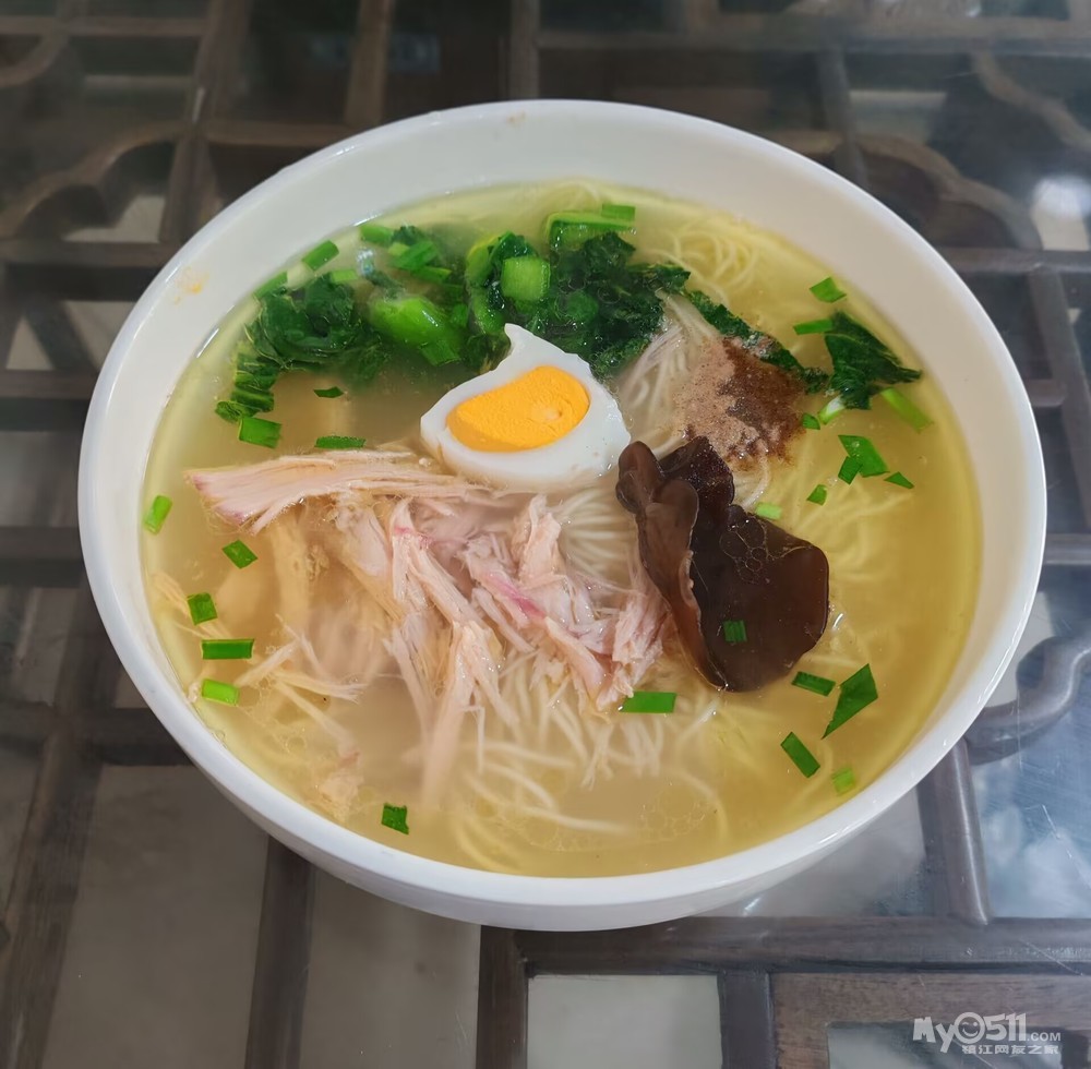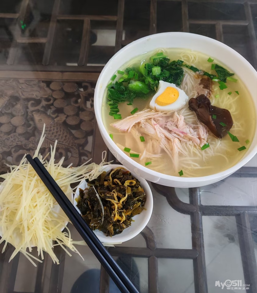 享用鸡汤面,最适合在秋风起,寒意袭的时节。冷飕飕的早晨来碗香浓美味的鸡汤面,暖意顿时包裹全身。镇江经营鸡汤面的不算多,三中附近的XX老太鸡汤面多年前曾经很火。好久没有去吃了,不知道现在如何?中南世纪城附近的鸡汤面,汤底很清澈,味道一般。还是钟情这家鸡汤面,浓浓的鸡汤,几根清晰可见的鸡丝,配上半个黄白相间的鸡蛋,点缀一点绿色的青菜叶,加上几片黑色的木耳,这个色彩搭配,看了就让人顿时有食欲。这里的鸡汤都是用几个大的电饭煲熬制的,肉眼可见,吃得安心。