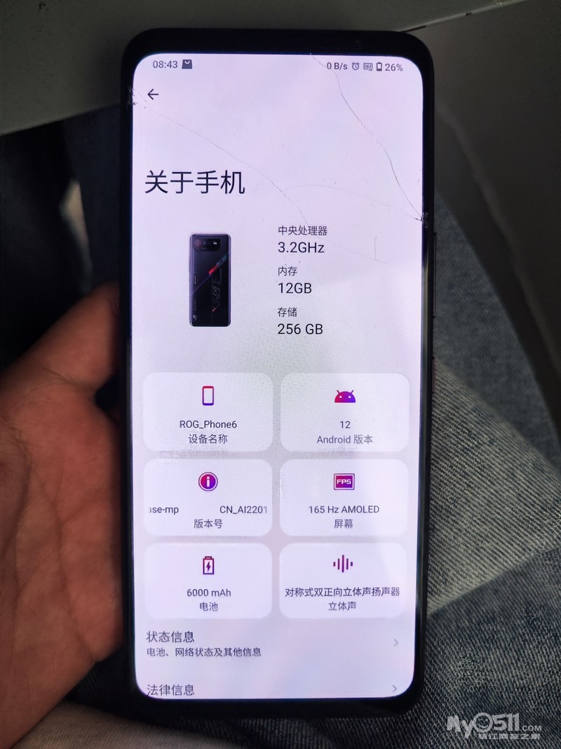 rog6 12+256G 屏幕完美 有细微小划痕 无透图老化 后盖摔碎了 相机有问题 手机通病 电源键有点不灵 需要用力按 边框成色如图 安卓14降级安卓12 不能随意升级和解除bl锁