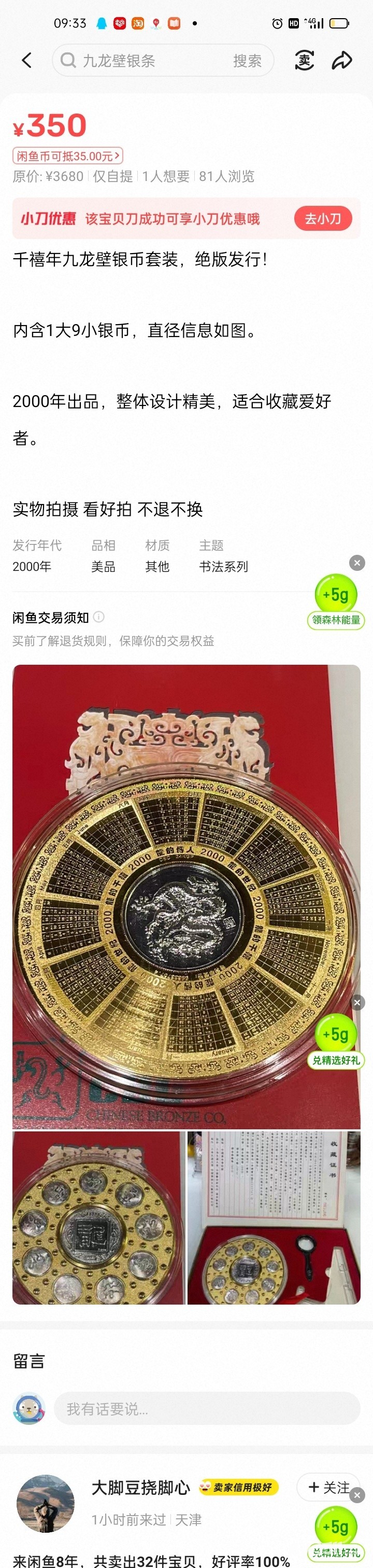 直径8.5厘米铜镀金镶银双色金属。千年龙年出品好像是最早的九龙壁章结合题材大师设计造币厂精致。 价格在咸鱼找到个同款阴没证书盒子了200出.需要的电,13062921760