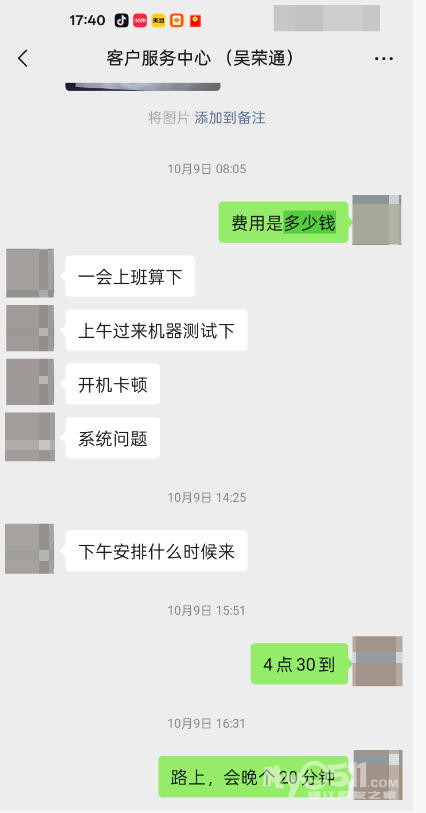 我:“我这个型号的电脑现在卖二手都卖不到500,500之内能修好你就修,不能的话告诉我一下”;