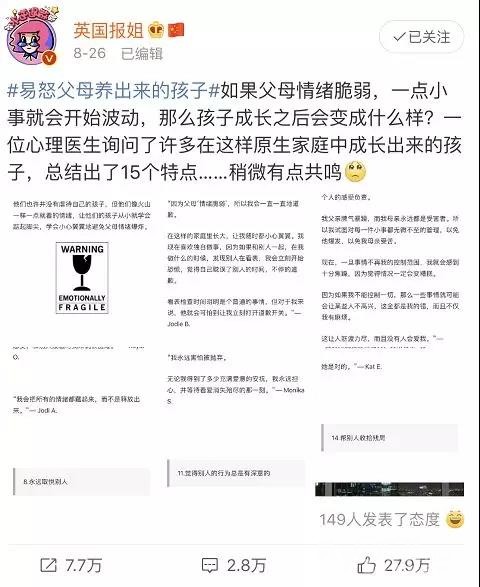 之前微博上有一个话题叫做#易怒父母养出来的孩子#,其中一条热门微博有7万多人转发,将近28万人点赞。