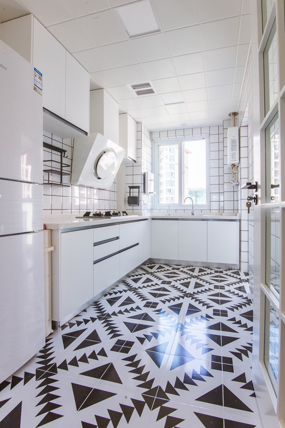 独特的选择了黑白搭配的异样花色,与卫生间,阳台的地砖统一了款式。