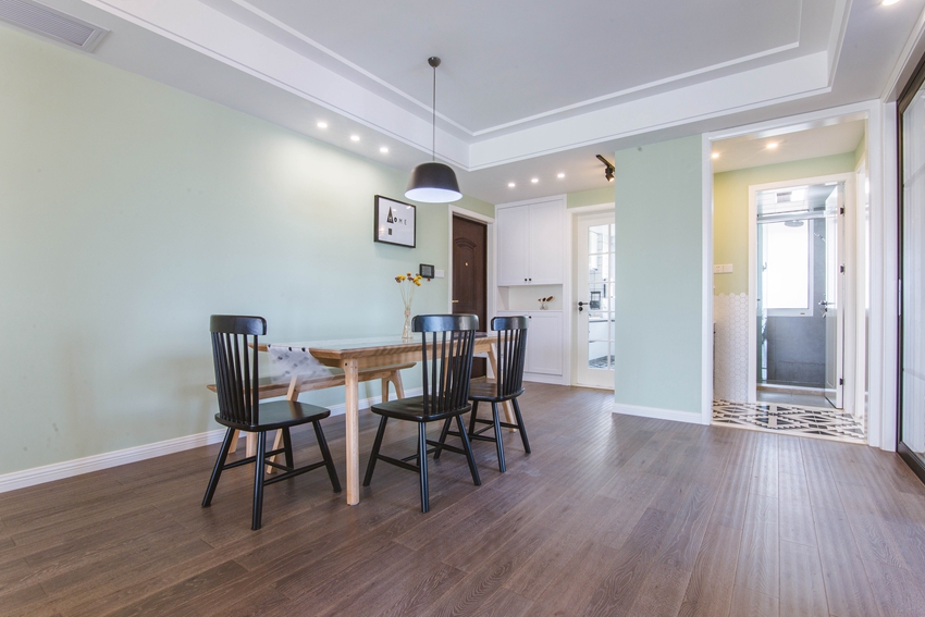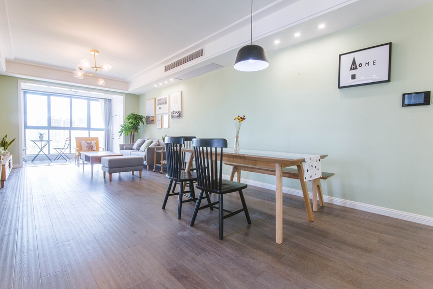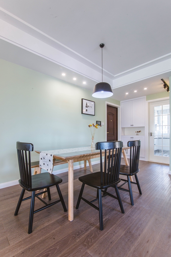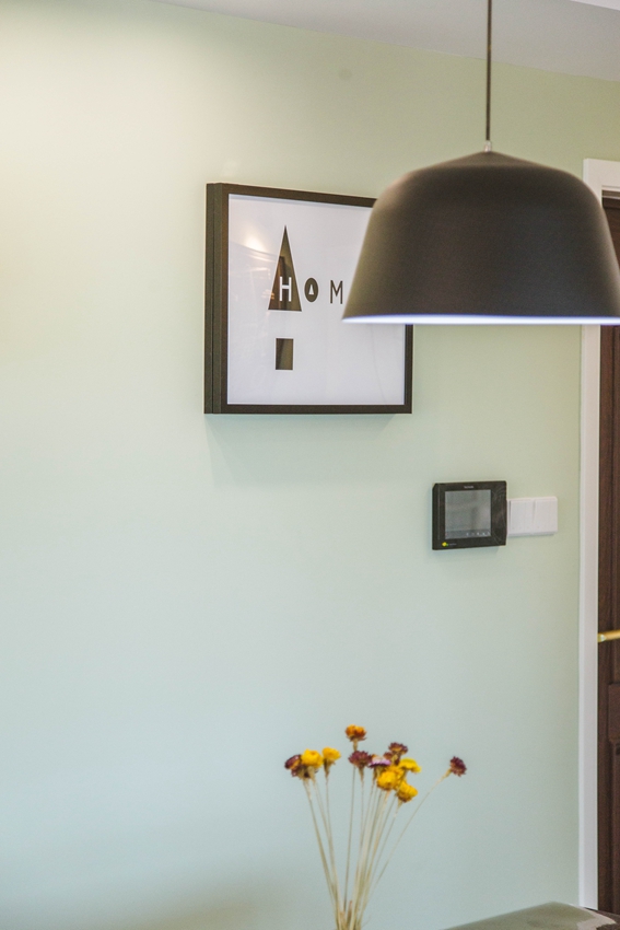 餐厅没有与客厅做明显的分界,融为一体,而大大的薄荷绿色背景墙,