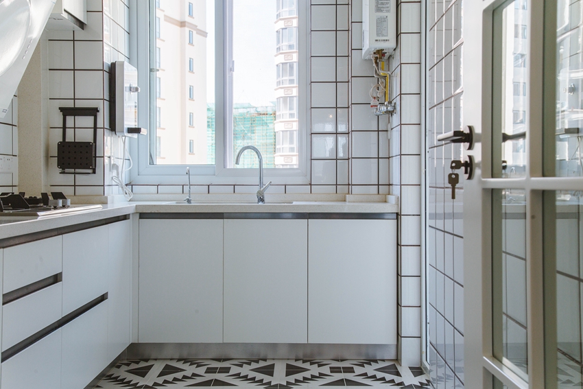 透明光亮的移门隔开了厨房与餐厅的空间,大面积的实用清爽干净的白色,而地砖则很