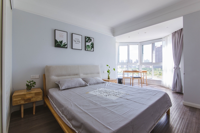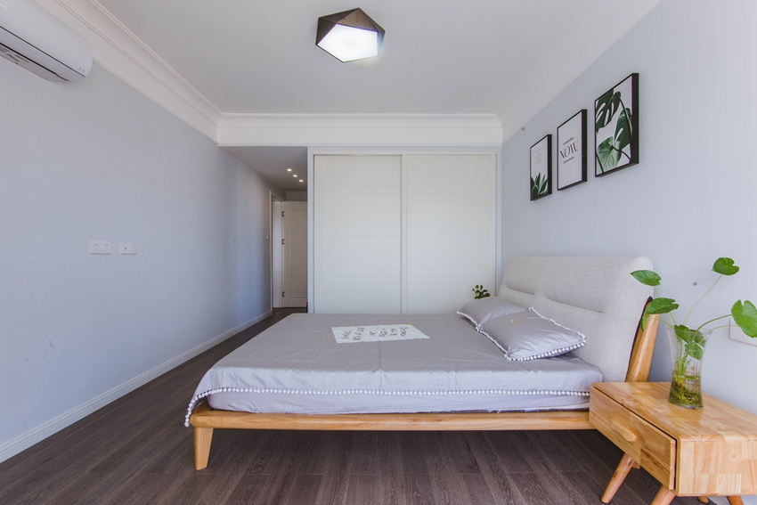 整个素色的主卧空间里,除了床头柜上的绿植外,尤其墙上