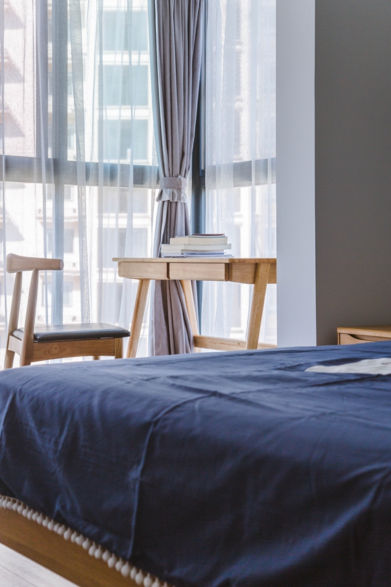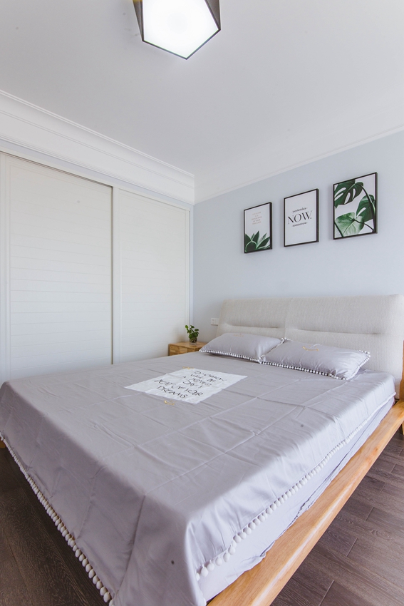 次卧空间线条利落,讲求空间中的尺度与平衡,清浅的色彩搭配与