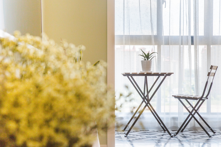 客厅淡色系的主沙发配以黄色的单人位沙发,又与阳台相呼应,