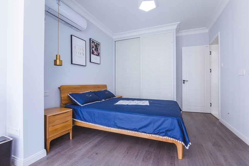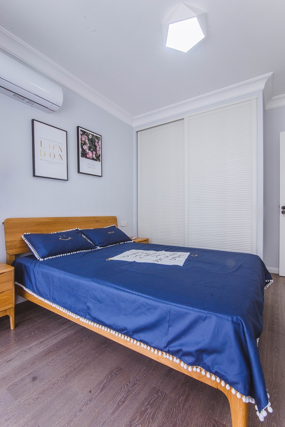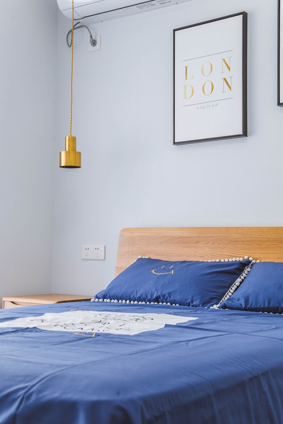 白与蓝的视觉冲击,搭配色彩打造出特色的简约舒适卧室。床边的