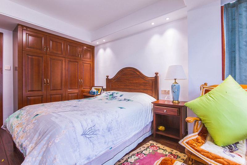 主卧以温暖的米黄色为主,蓝色、白色作为空间点缀,