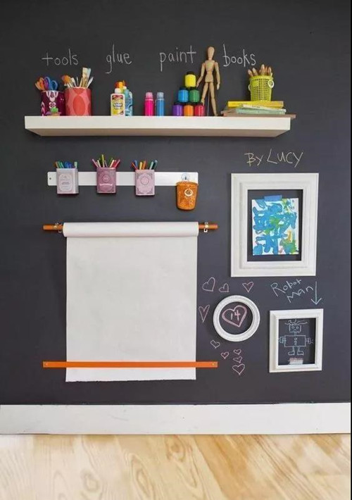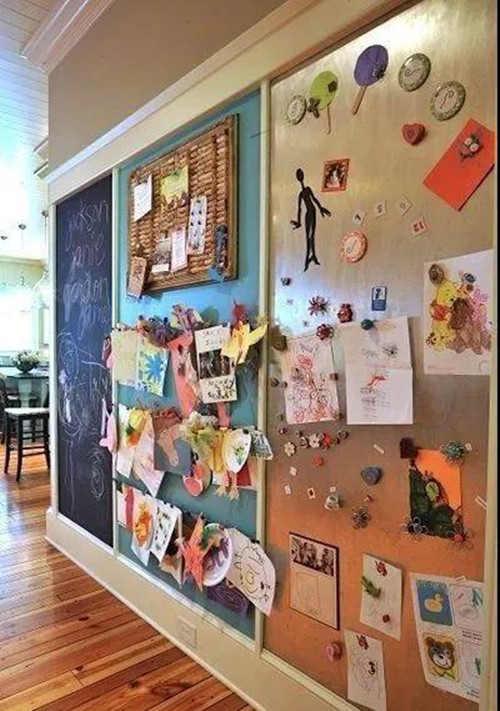 可以设置一块软木板,这样孩子的奖状、作品等都可以挂出来展示,精心布置的这块墙面也是你和孩子的亲子空间。