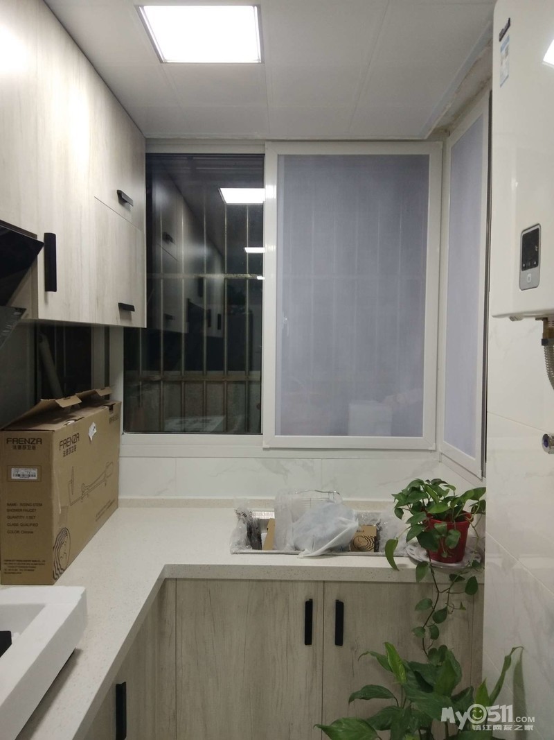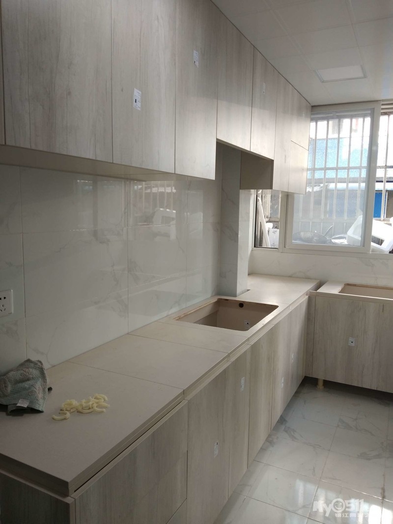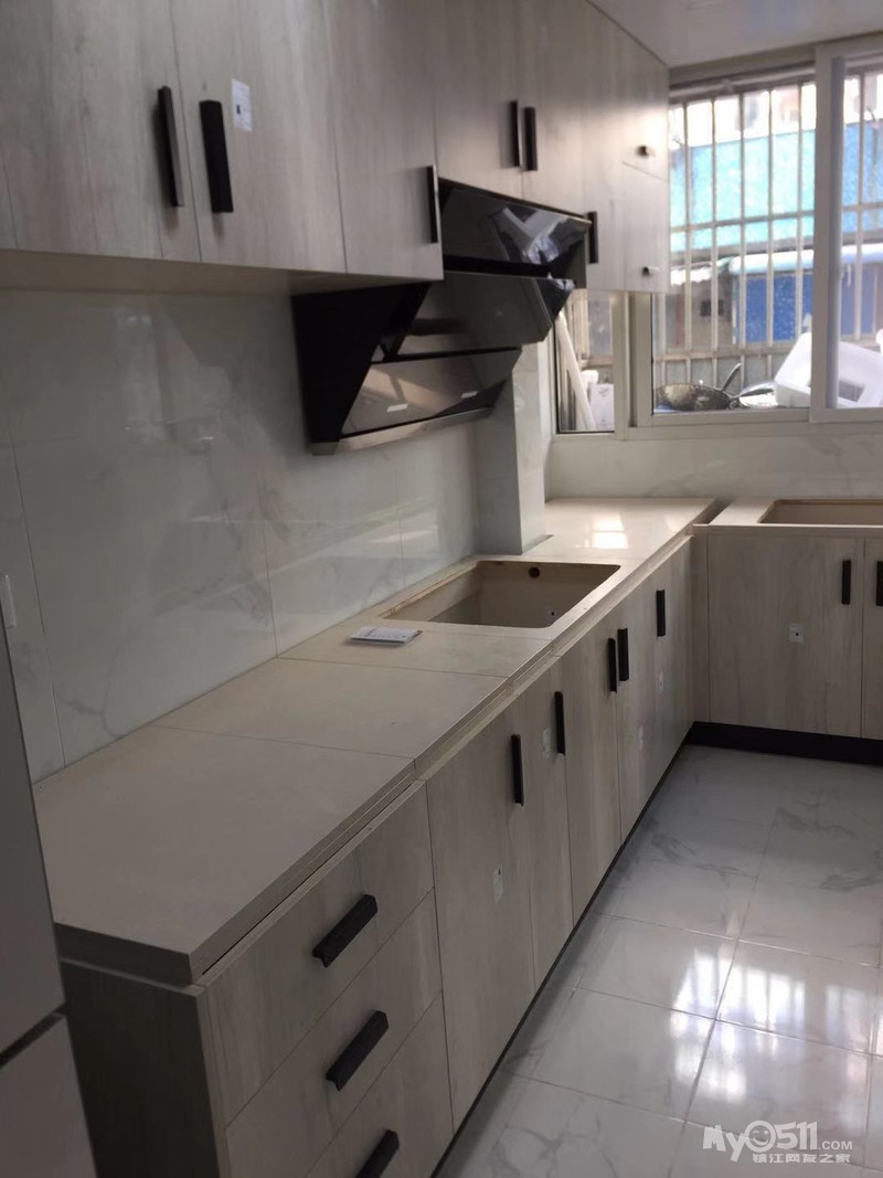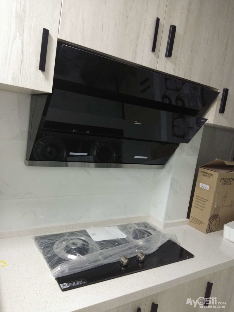 今天橱柜装好了,颜色很喜欢,和地板还有点像,在谷居定了一套美的油烟灶套餐,一个电话安装工人就到了,厨房台面还没安装,只能让师傅装了油烟机,下次再约装灶台了,真不好意思。