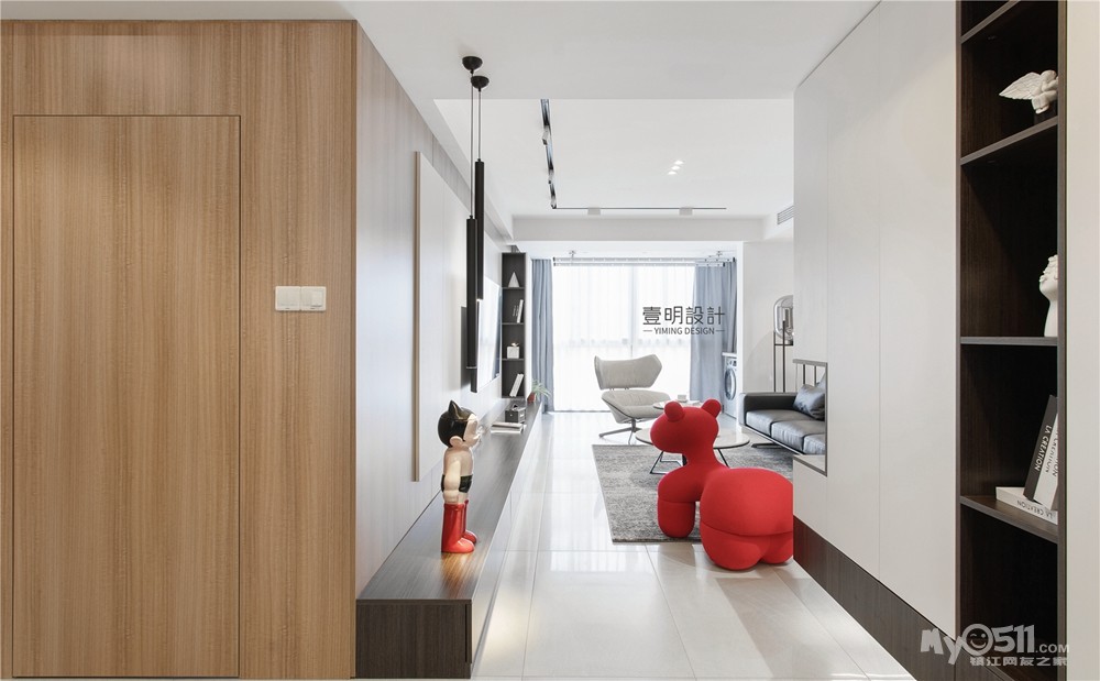 入户为平墙,我们倒不喜欢到处挂画,所以将木饰面做层次,