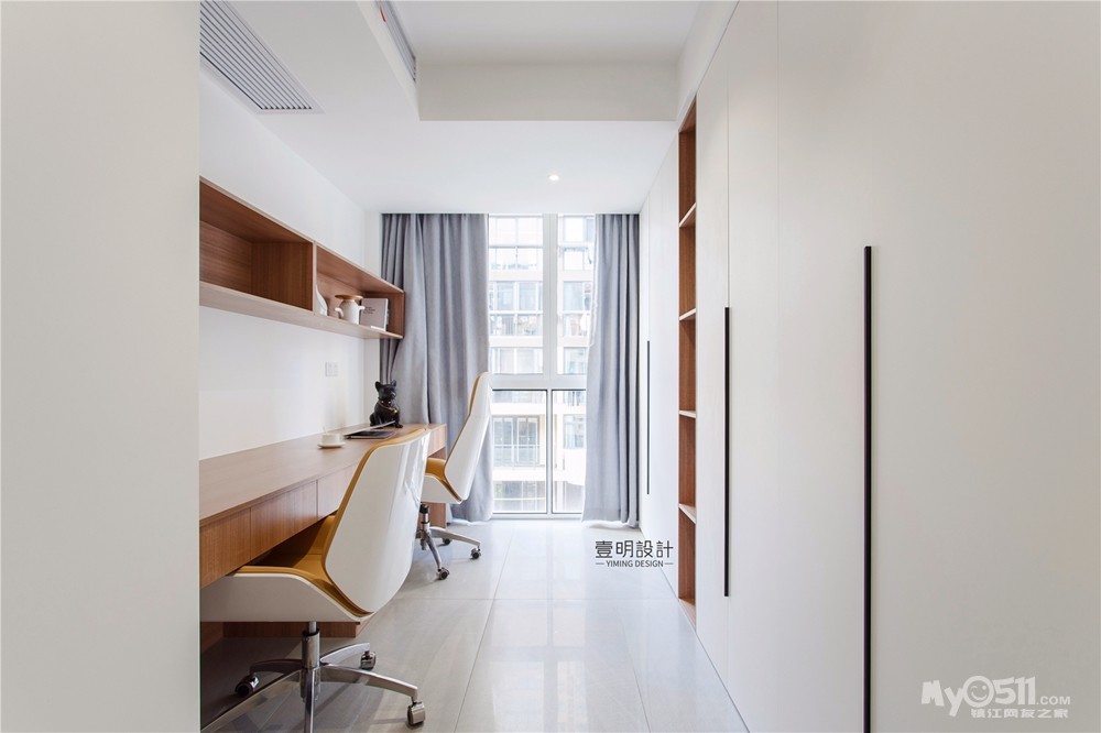 书房的设计比较简单大气,木色上柜+高低不一大小书椅,后背景为550厚度大收纳的衣柜。
