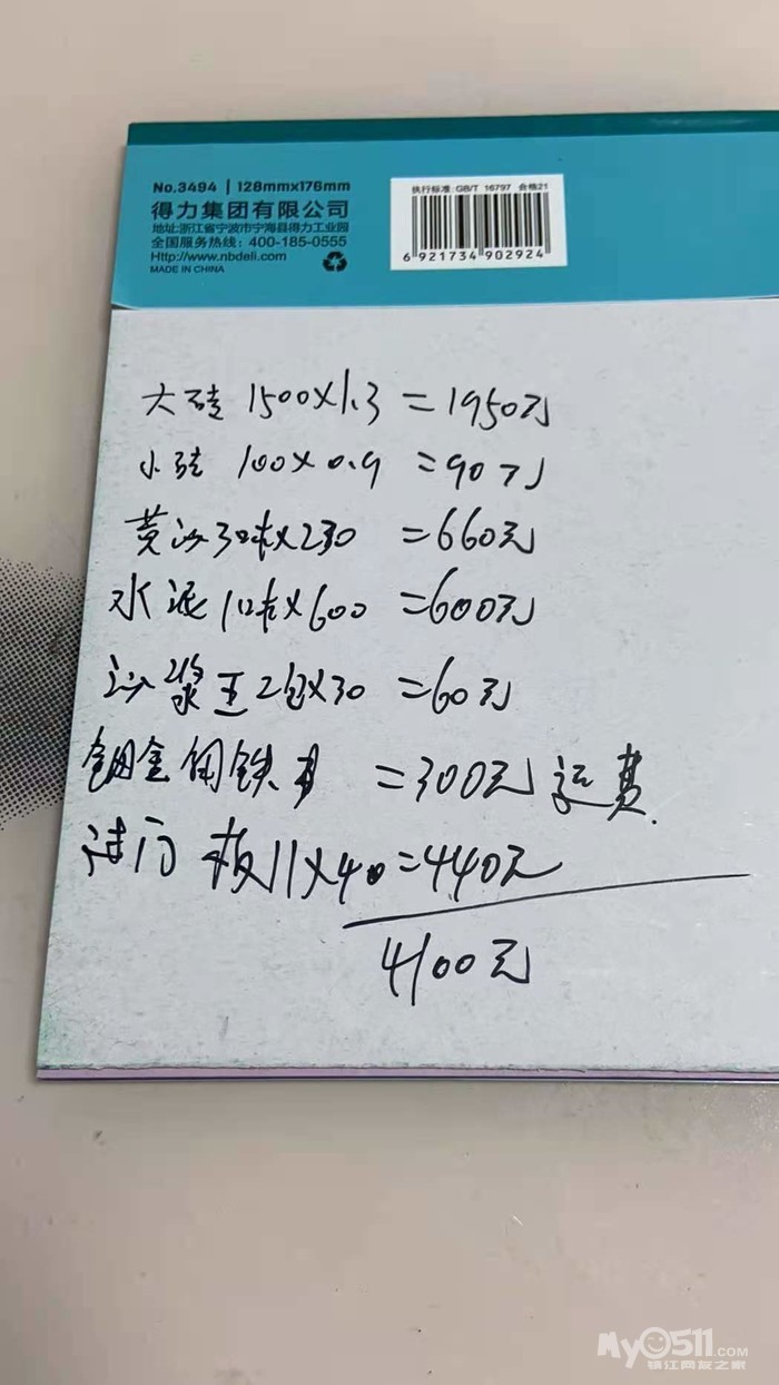 20之前刚买的,水泥500,黄沙150,红砖0.8