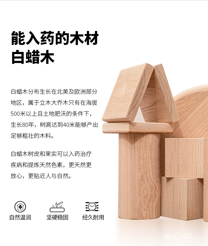 产品所有木材均选用纹路美丽的进口白蜡木,追求人性化、简约化和时尚感,无辅材、无指接板、无贴皮,加工性能很好,质地坚实,结构牢固。