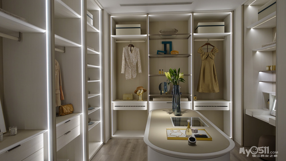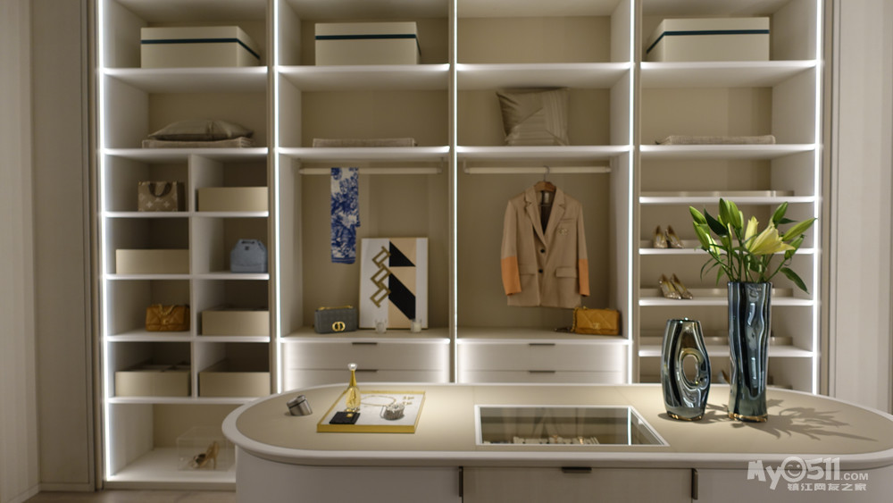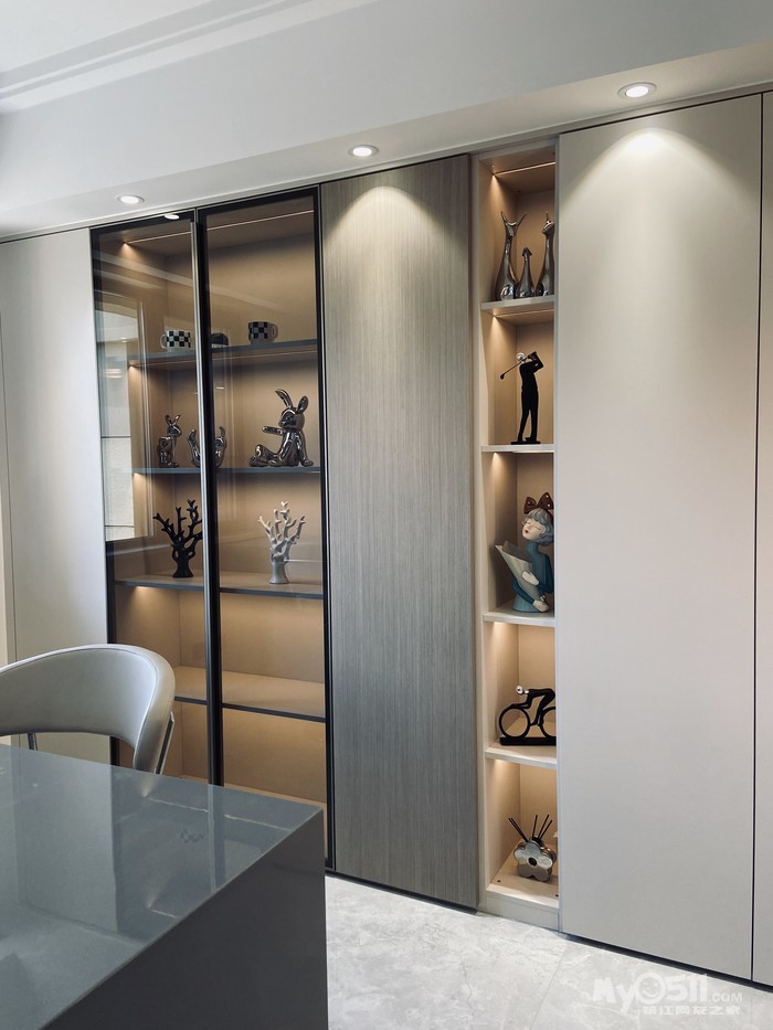 在装饰柜的两侧用了贝母白的木饰面,这款我们M77特有的色板,近看珍珠漆和金属漆打造出的特有纹路,惊艳 细腻 极致,绝对是低调奢华的首选。两边做了通顶的隐形门,整个木饰面的我们利用不规则的拼缝设计把控在门关闭时完美的融为一体,达到真正的隐形效果。