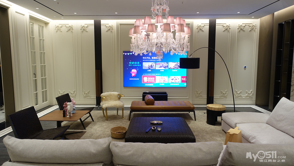 那这边是客厅,客厅作为家里最重要的起居空间,所有的设备能根据实际使用时的场景要求来调节,真的是很实用很有必要的。比如有亲朋好友来,大都在客厅,这时选择一下会客模式,吊灯,沙发周围的射灯,所有的灯带,包括壁炉亮度都缓缓的开启到我们需要的亮度,纱帘慢慢关闭,布帘慢慢打开,背景音乐渐渐响起,这样的整体氛围,感觉是和传统只是开关灯光的方式完全不一样的,当觉得背景音乐音量过大或者是过小时,也可以通过遥控器上的按键来调节,可以试一下,或者是用摩根专属的旋转控制方式体验一下丝滑的操控感受。晚饭后一家人坐在沙发上享受一下餐后休闲时光,按一下休闲模式,现在我们所有的灯带、射灯、吊灯都会层层的缓缓变暗,您看再整个暗到整个空间变黑的一刹那,吊灯周围的六个冷光灯开始慢慢变亮,照在巴卡拉水晶上,水晶本身不发光,冷光灯照的水晶闪闪发亮,同时符合餐后休闲时光主题的音乐缓缓响起,一家人用过晚餐后,可以在客厅吃着水果 聊聊天,每天都享受一下这种家庭休闲时光,只需按一个键,瞬间就从一个很正常的空间变成另一个不一样的空间,无论是高端的家居还是考究的墙饰 地面,都呈现出不一样的感觉来。我们也可以通过遥控器按一下思考模式,音乐变得轻柔舒缓,一个人静静的喝着茶,想想事情,整理整理工作思路,享受个人独处空间,伴随着温暖跳动的壁炉,整个人都放松下来了。如果家里有人喜欢看电视的亲,按一个电视模式,电视慢慢打开,客厅灯光会层层变暗,从100%的亮度降到30%的亮度