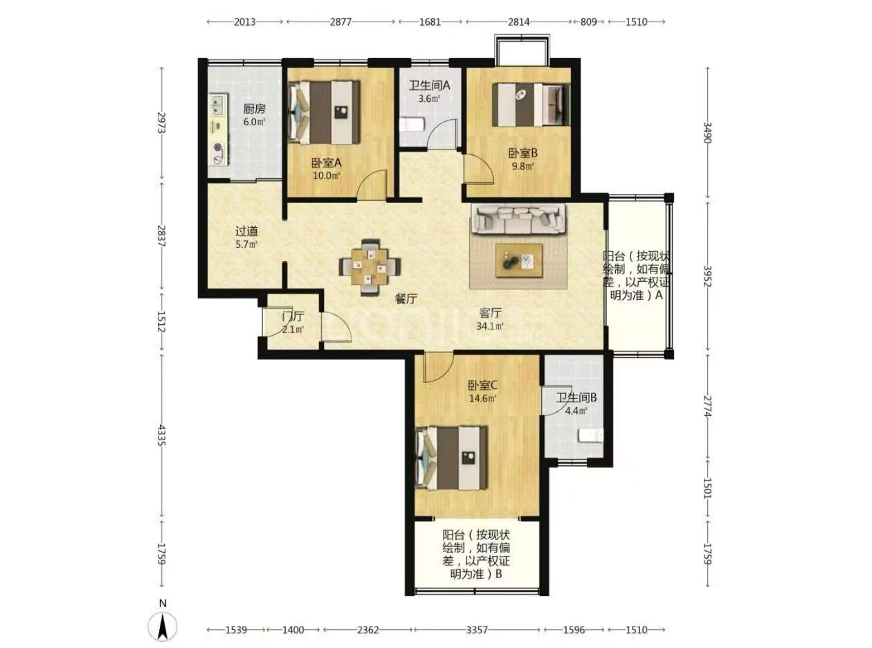 万达商圈 三室二厅 103平边户全明户型 自装带个小院子