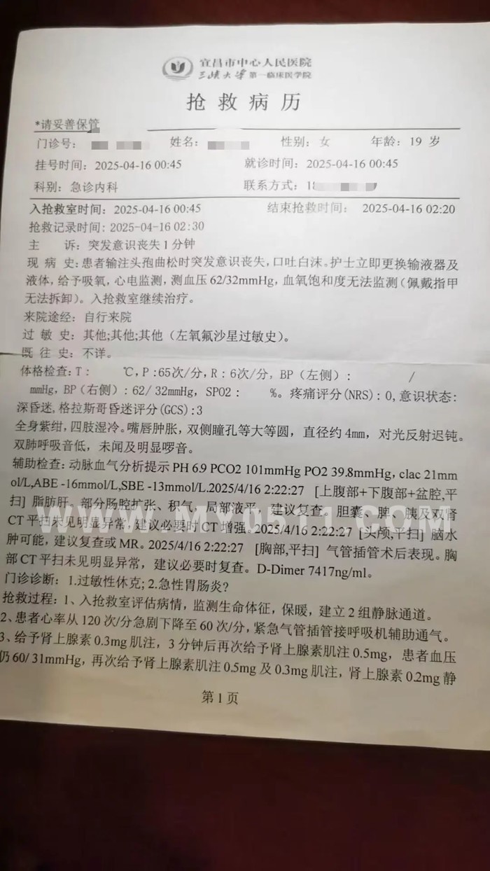 女生家属质疑医院未做皮试,抢救也不及时。医院认为,医生诊断及用药合理,患者的过敏性休克系罕见且严重的不良反应,院方予以积极治疗。