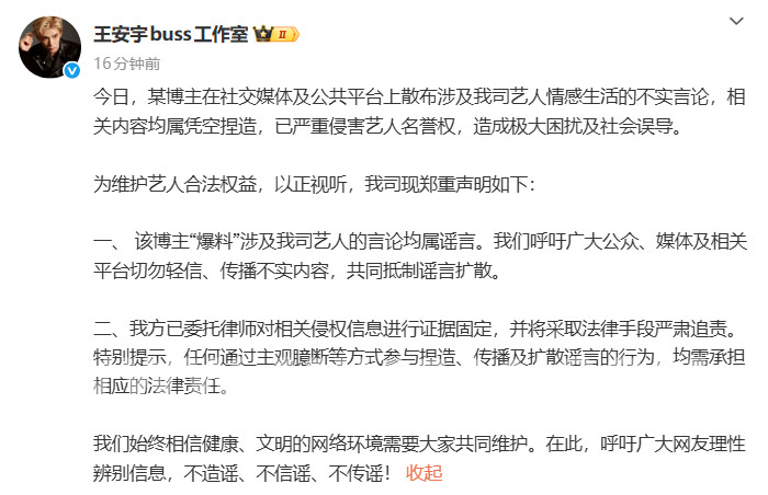 一、 该博主“爆料”涉及我司艺人的言论均属谣言。我们呼吁广大公众、媒体及相关平台切勿轻信、传播不实内容,共同抵制谣言扩散。