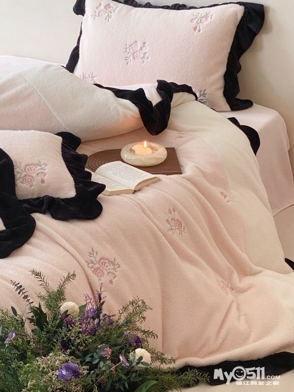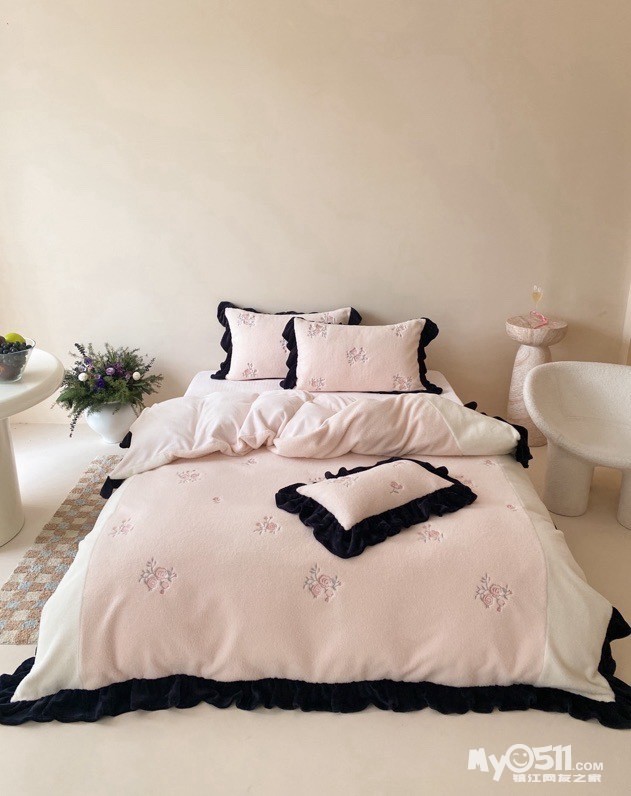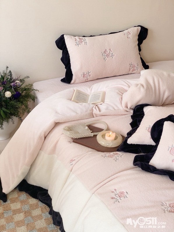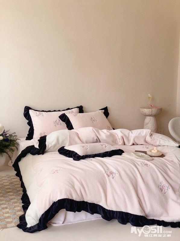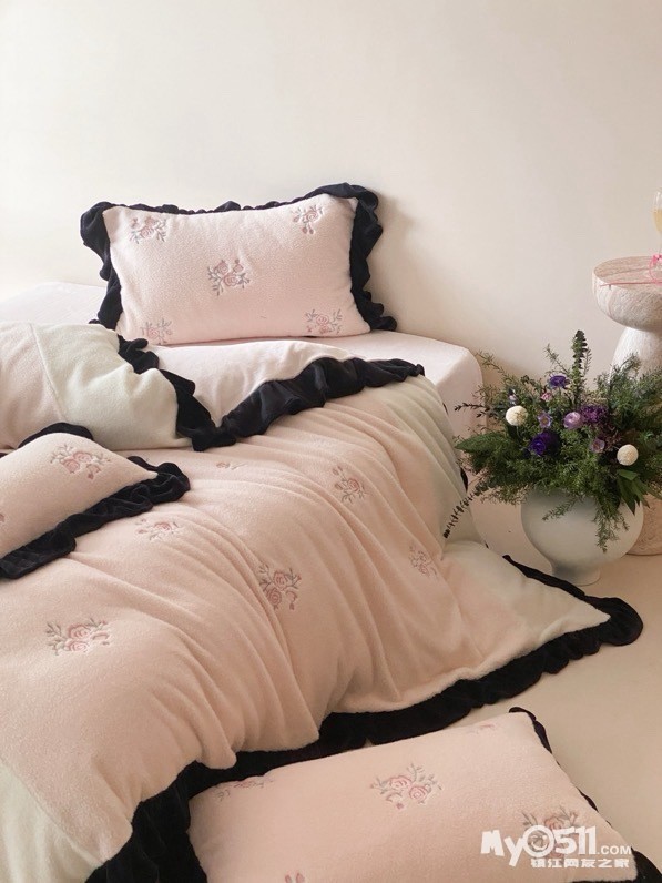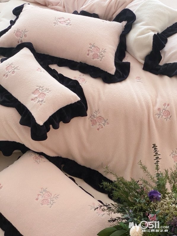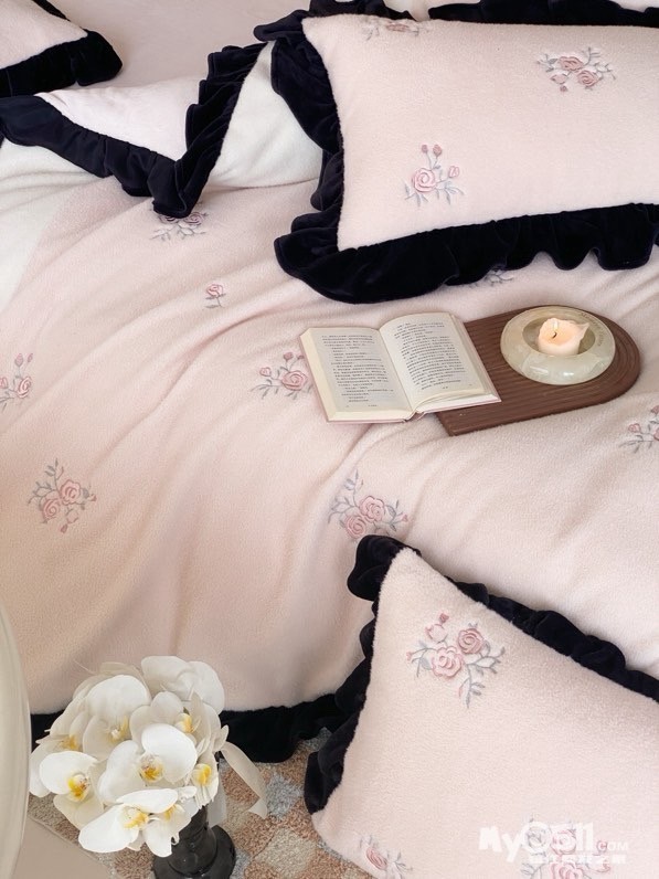 黑色法式荷叶边,弧度自然灵动,不夸张不繁复,却自带复古优雅,让卧室跳出“单调感”——粉白拼接的色调淡雅有层次,玫瑰花刺绣点缀其间恰到好处,越用越有“时光沉淀的精致”