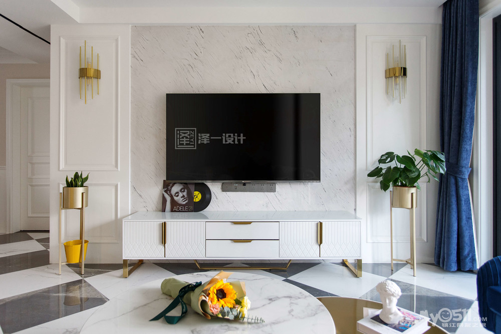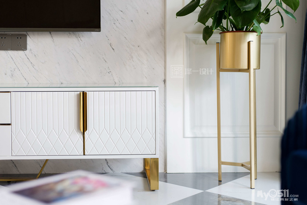 在边几、电视柜、茶几和软装配饰上,选择了充满质感的金色元素,给人一种恰到好处的奢侈感。