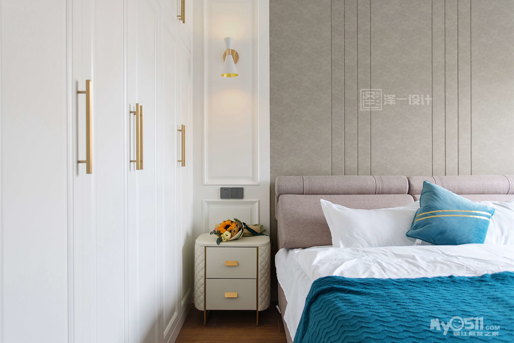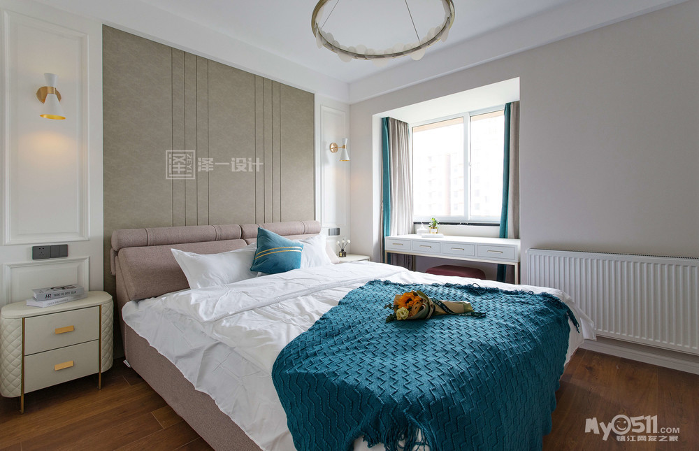 一个采光极好的梳妆台,一组造型别致的矮柜,让整个主卧空间精致而温馨。