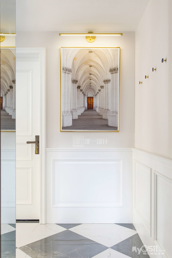 门厅入户正对的墙面,选择了一幅具有视觉延展效果的装饰画,配合金属壁灯让整个空间不显得拥堵。