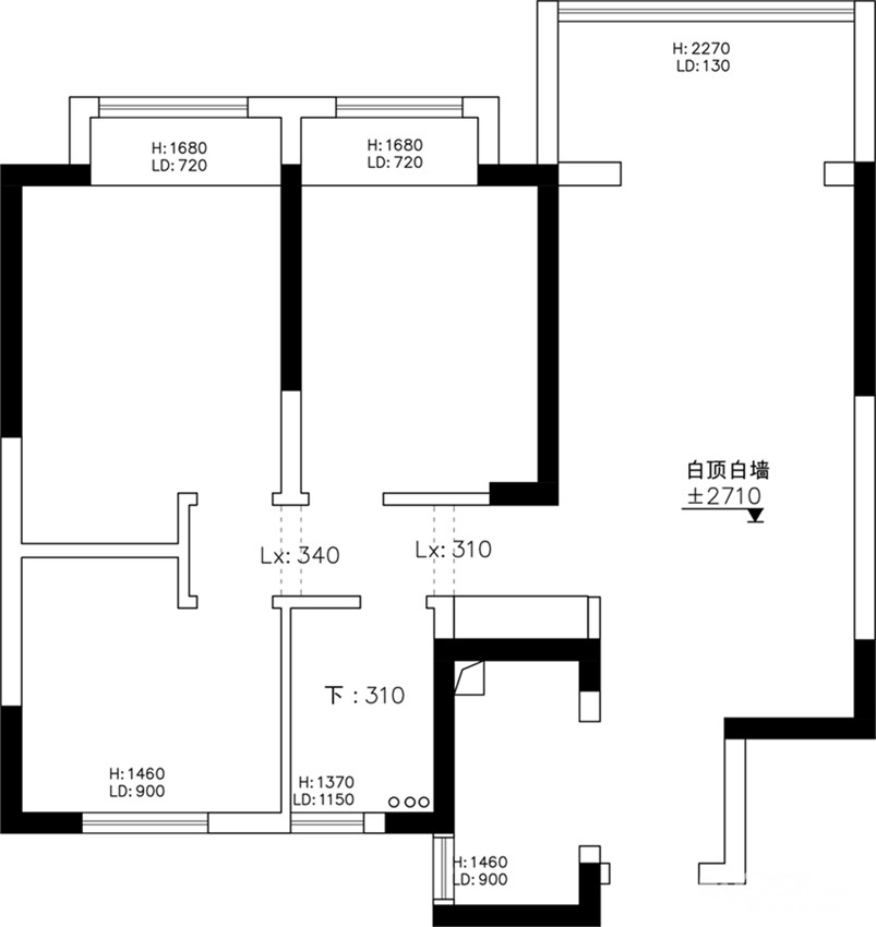 原始户型房朝南向,阳光充盈,但空间分配不够均衡,卫生间较小,不能干湿分离,