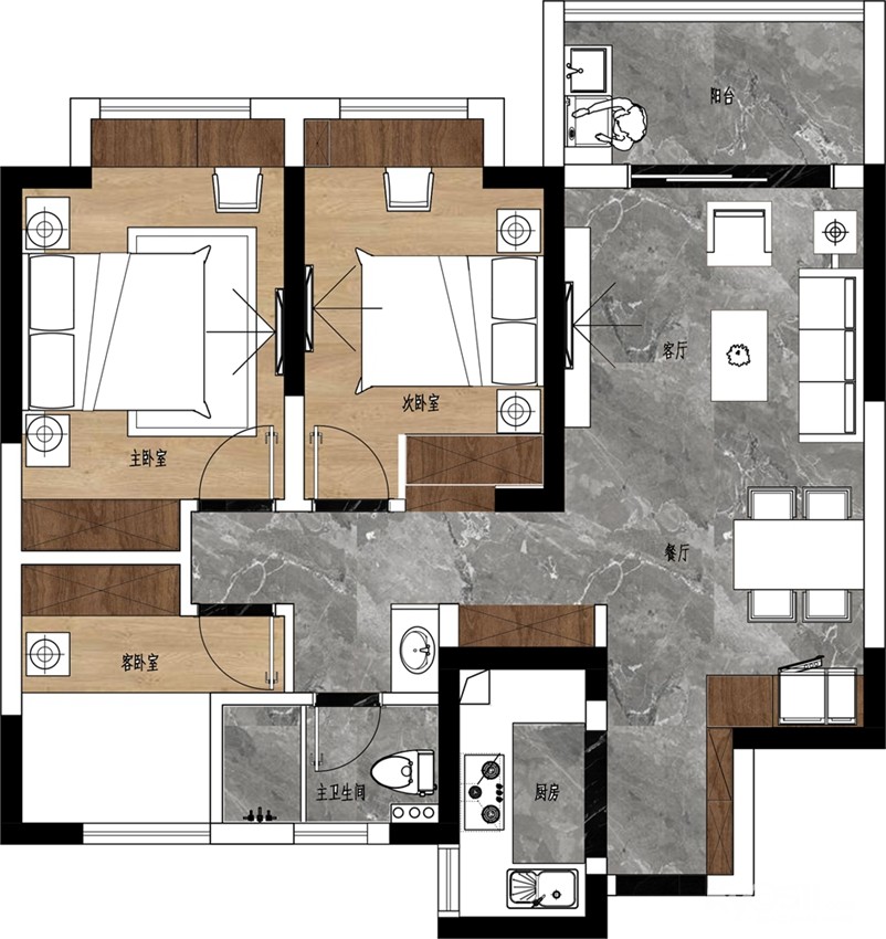 卫生间的墙扩向北边小卧室,格出干湿分离卫生间,各区域多余空间都作出柜子,达到后期储物要求。