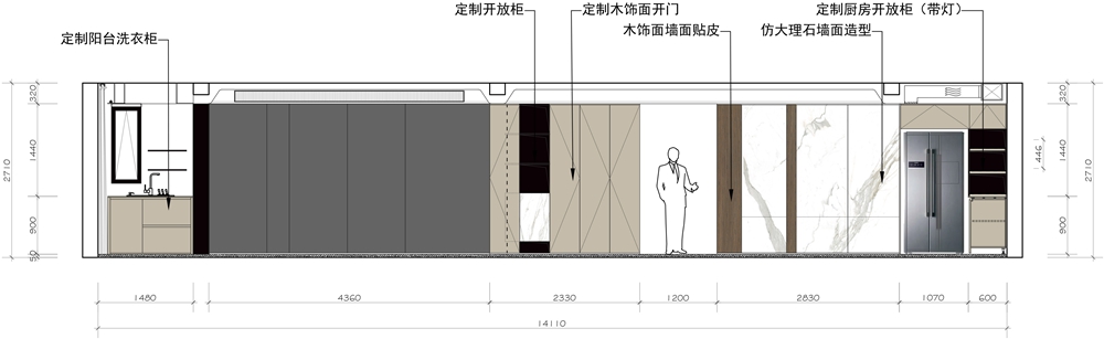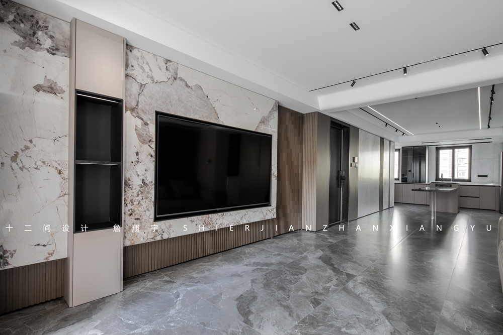 本案的阳台、客厅、餐厅、厨房一体南北通透,径深12米,通过不同材质的穿插实现墙面的协调统一。