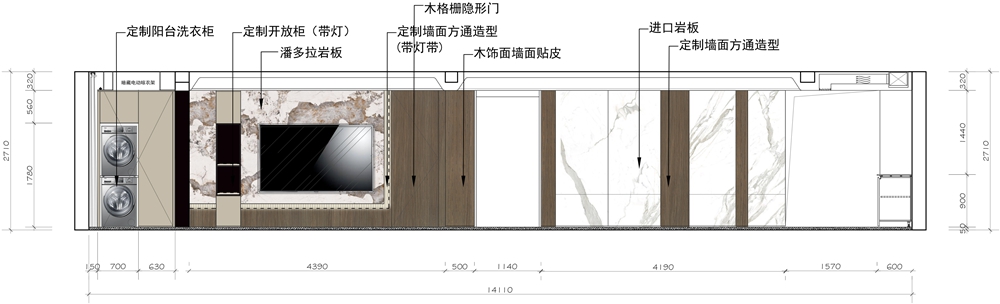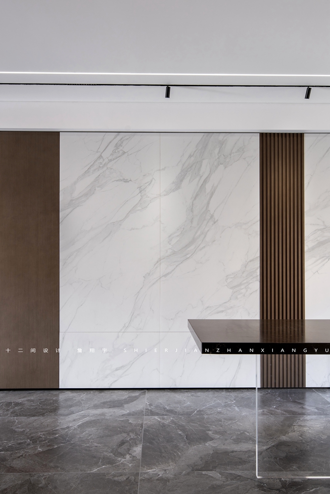 本案的整体墙面材质拼接的呈现效果如下,不同材质的收口工整。