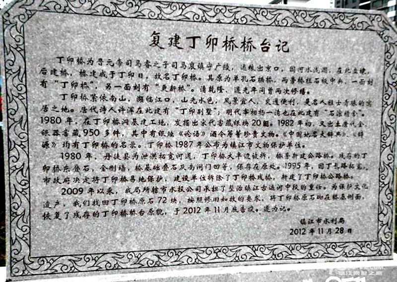 而“丁卯”之名的由来,更是一段活着的史话。东晋那年,皇家的粮船在京口困顿难行。于是人们筑埭蓄水,这救急的土坝,恰在丁卯日建成,便得了“丁卯埭”这个带着干支纪年古风的名字。一个日子,就这样凝固成一方水土的称谓。埭成,水位抬升,南山溪流四明河域一下子宽阔起来,后来便有了港;丁卯桥是连接镇江辛丰丹阳千年古驿道上的桥,《润州区志》(一轮修志)记载:丁卯桥,位于丁卯村,距今已近1600 年,是座单孔石拱桥。桥如一轮满月坠在水上,桥石两边镌刻“丁卯桥”与“更新桥”的字样,这是清乾隆、道光年间两次修缮的痕迹。可惜,上世纪八十年代河道拓宽,拆去了它的大半边,只余下东岸的叠石与桥基,像一位被时光磨损了身躯的老者,倔强地不肯完全倒下。现在运河广场那边,有几座桥,找到丁卯桥细看河边,可以寻到老桥残基。