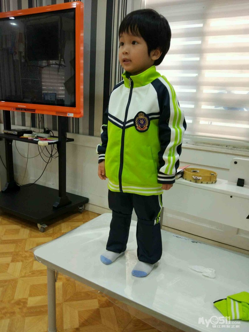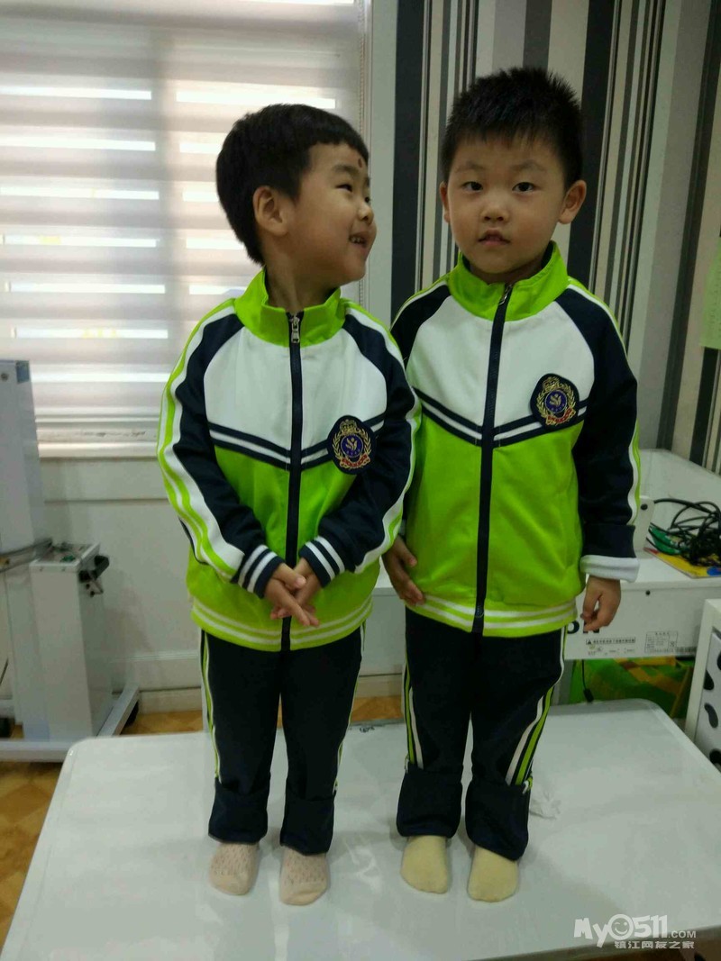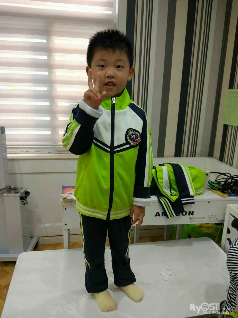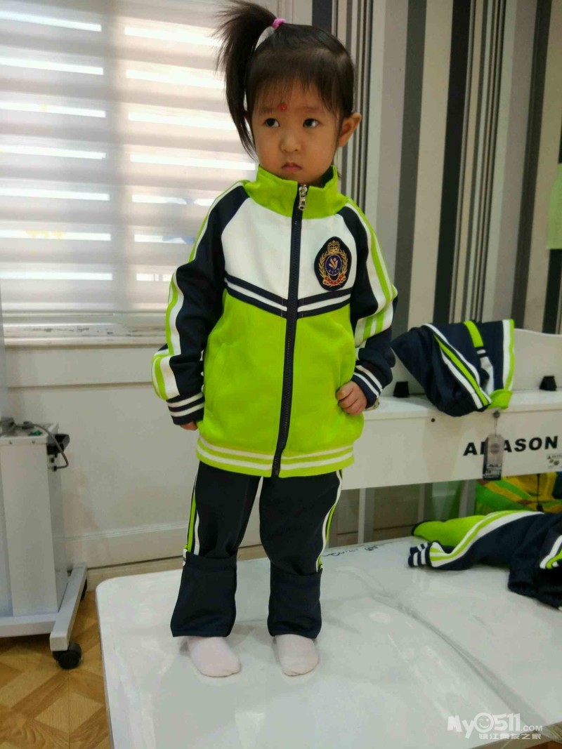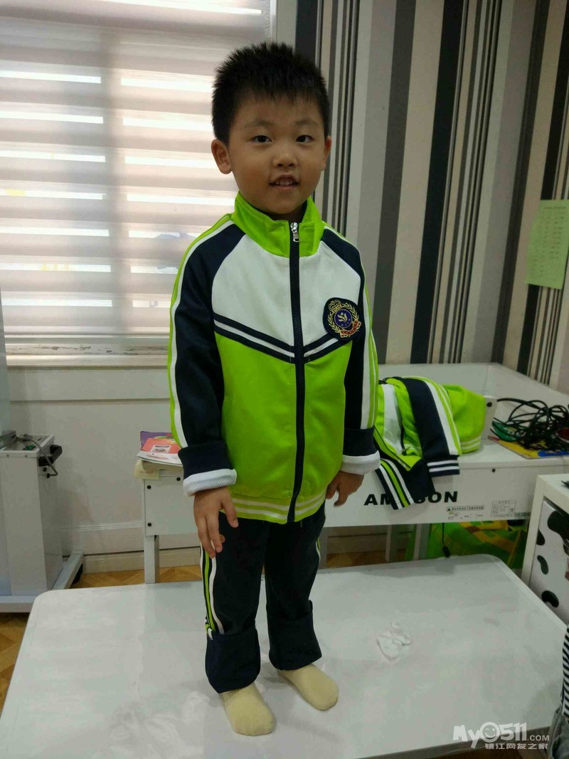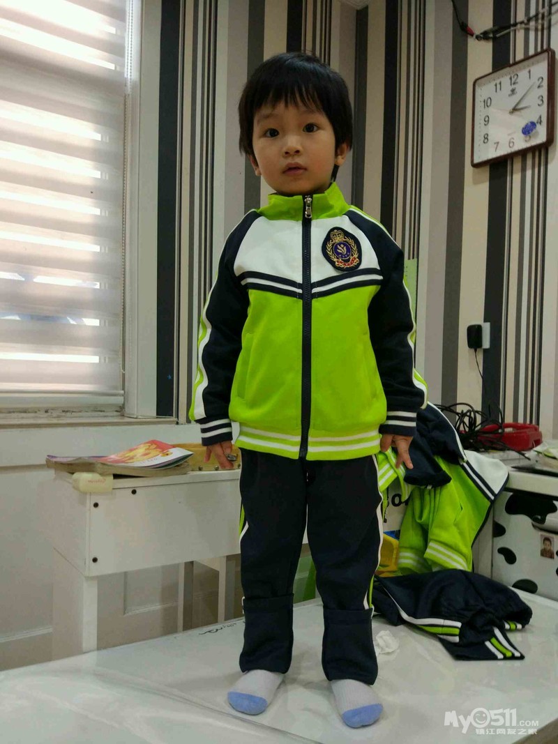 这是我们班的园服,王高泽穿的120的效果,裤腿卷起来了两折,大概10厘米